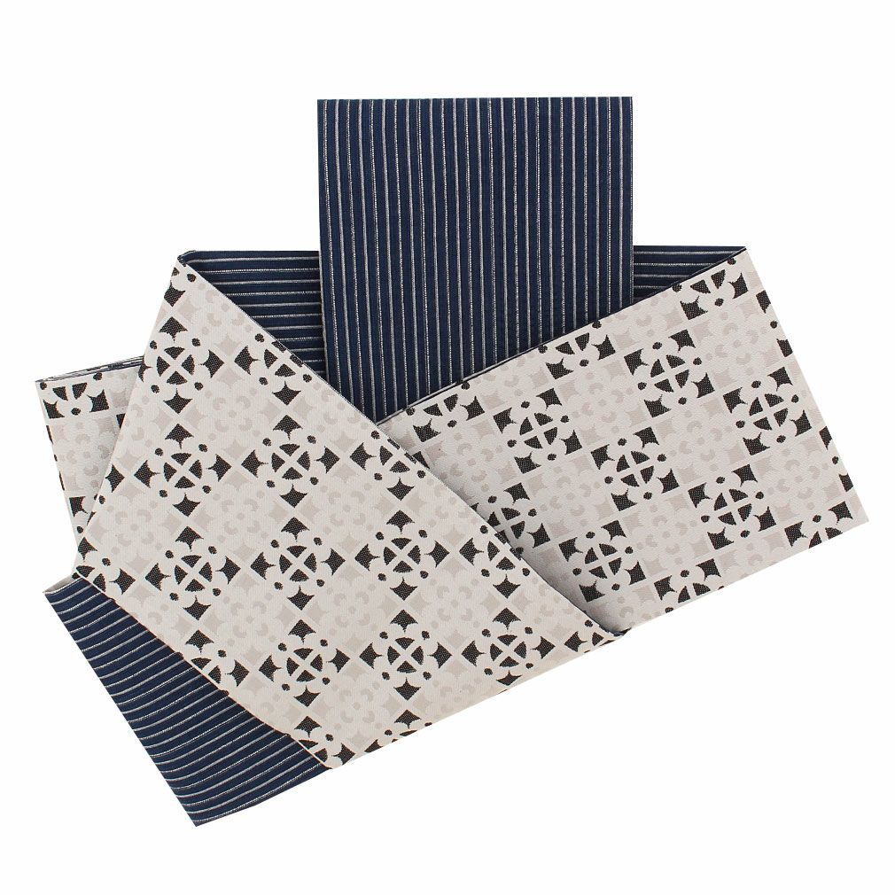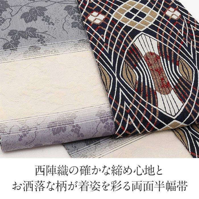 他の画像を見る ≪在庫限り≫ 西陣織 長尺で色々な結び方が楽しめる半幅帯 半幅帯 正絹 帯 半巾帯 普段用 濃紺 紫 生成り グレー 幾何学 縞 葡萄 リバーシブル 西陣織 大光織物 カジュアル 長尺 日本製 当店特別価格 ¥ 26,400 税込 カートに入れる お気に入りに登録する
