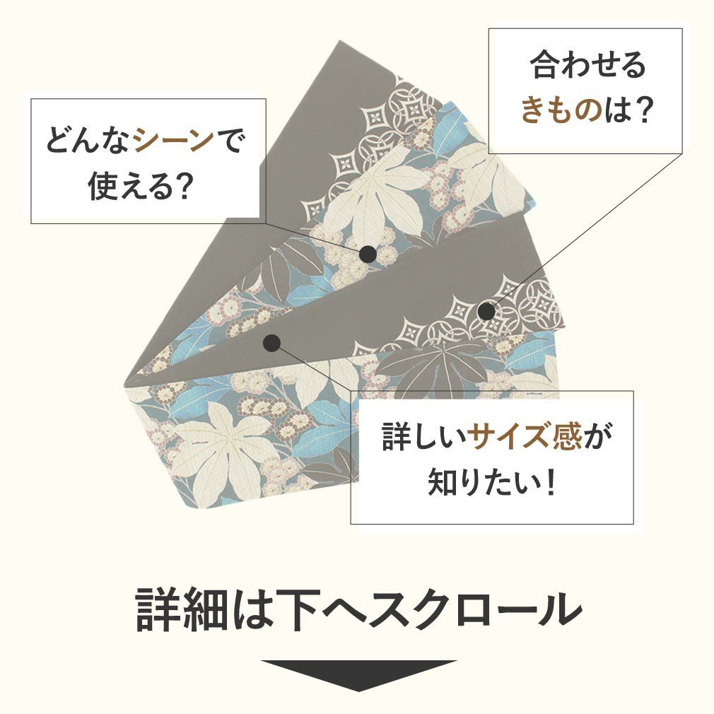 他の画像を見る ≪在庫限り≫ 西陣織 長尺で色々な結び方が楽しめる半幅帯 半幅帯 正絹 帯 半巾帯 普段用 濃グレー 薄茶 紫 緑 水色 生成り 花更紗 吉祥文様 リバーシブル 西陣織 大光織物 カジュアル 長尺 日本製 当店特別価格 ¥ 26,400 税込 カートに入れる お気に入りに登録する