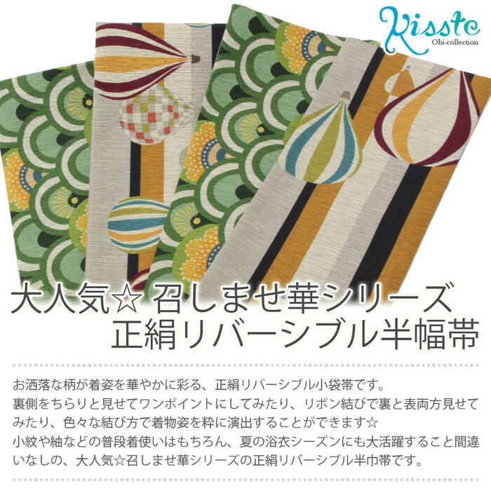 他の画像を見る 【最短日お届け】《召しませ花》小紋などのカジュアルなお着物や夏の着物・単衣に 半幅帯 長尺 帯 正絹 リバーシブル 召しませ花 黄色 気球 青海波 当店特別価格 ¥ 44,000 税込 カートに入れる お気に入りに登録する