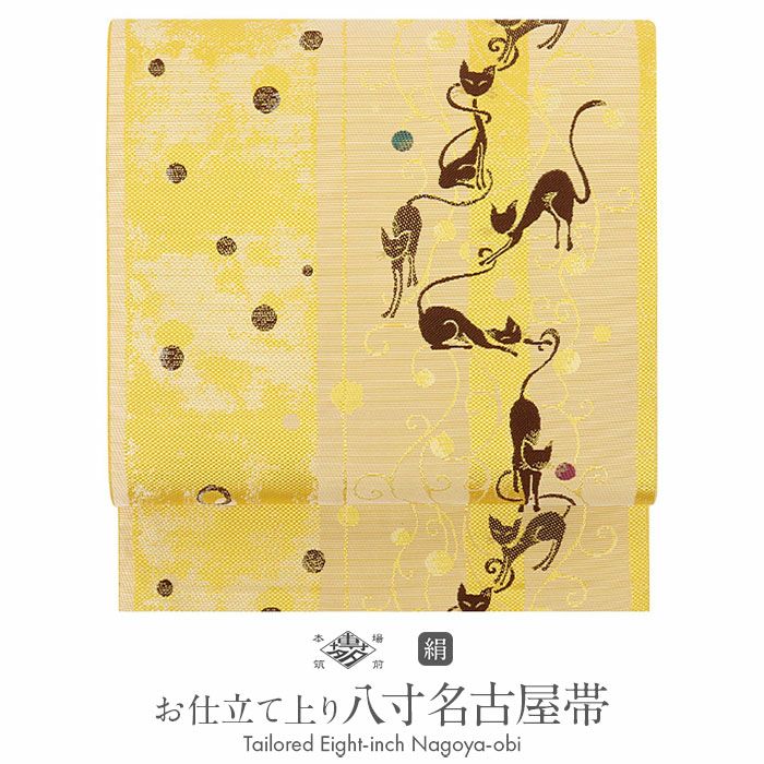 届いてすぐに使えるお仕立上りの本場筑前博多織の八寸名古屋帯です。 可愛い猫の様々なスタイルが描かれた可愛いらしいデザイン。 猫以外にも、地に施された蔦の柄や、まだら模様は細部までこだわりを感じます。 散らばるドットもランダムな形でカジュアルさをプラス。茶色だけじゃなく、青系や紫系の色味もこっそり入っています。 締め心地も気持ちがよく、「キュッ」とした絹鳴りが響くほど。締まりやすく緩まないのも博多帯ならではです。 小紋や紬、色無地、街着などのカジュアルきものに最適で、手軽にお洒落を楽しめます。 観劇、芸術鑑賞、ショッピング、ちょっとしたお出掛け等幅広くご活用くださいませ。