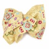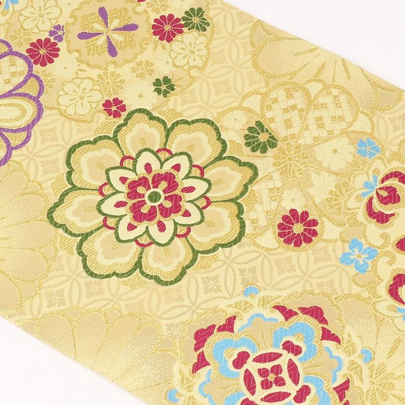 振袖にお使いいただける、西陣織お仕立て上り袋帯です。 華やかな色遣いの華紋などが帯全体を彩られており、晴れの日にピッタリのデザインです。 帯は伝統工芸の西陣織にて仕立てられており、染められた糸を複雑に織って模様を作るので、完成までに多数の工程があり、とても手間暇がかかる高級絹織物です。 こうして丁寧に織られた生地は、先染めしてから織っているので、一般的な染色法の後染めより丈夫でシワになりにくいのが特徴です。 正絹の帯には、金糸をふんだんに使用しており、魅入ってしまうほどの美しい輝きが魅力的。 光の当たり方で、絹の柔らかな光沢や金糸が反射し、豪華絢爛な帯がお楽しみいただけます。 絹の質感と光沢、大胆で鮮麗な柄が、大切なお祝いの席を華やかに演出してくれるでしょう。 結婚式やパーティーでの振袖はもちろん、一度きりの成人式に相応しい豪華な逸品です。