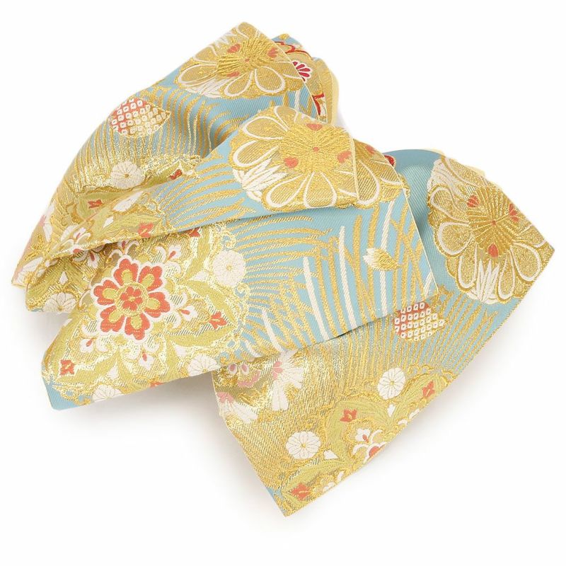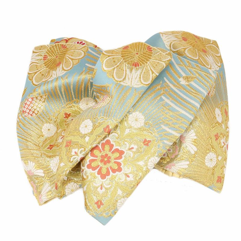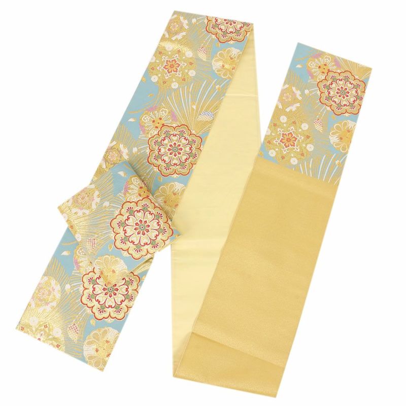 振袖にお使いいただける、西陣織お仕立て上り袋帯です。 華やかな色遣いの華紋などが帯全体を彩られており、晴れの日にピッタリのデザインです。 帯は伝統工芸の西陣織にて仕立てられており、染められた糸を複雑に織って模様を作るので、完成までに多数の工程があり、とても手間暇がかかる高級絹織物です。 こうして丁寧に織られた生地は、先染めしてから織っているので、一般的な染色法の後染めより丈夫でシワになりにくいのが特徴です。 正絹の帯には、金糸をふんだんに使用しており、魅入ってしまうほどの美しい輝きが魅力的。 光の当たり方で、絹の柔らかな光沢や金糸が反射し、豪華絢爛な帯がお楽しみいただけます。 絹の質感と光沢、大胆で鮮麗な柄が、大切なお祝いの席を華やかに演出してくれるでしょう。 結婚式やパーティーでの振袖はもちろん、一度きりの成人式に相応しい豪華な逸品です。