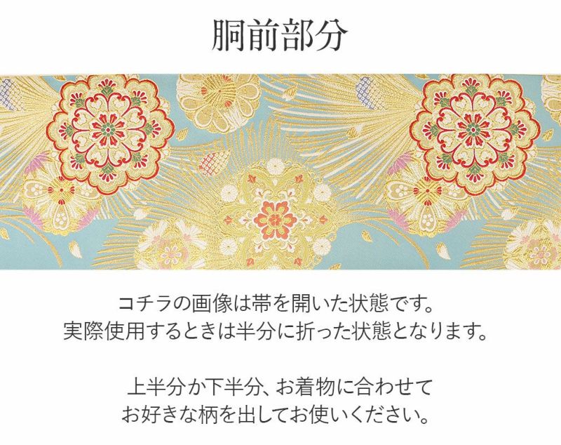 ●実際の商品と同じ色合いに画像修正をしておりますが、環境やモニターの違いにより多少色の違いが出て来ることがあります、ご了承ください。 ●帯の裏側や着用時に見えない部分に、サビ糸などによる黒い線や染色飛びなどが出ている場合があります。 工程上によるものでございますので、安心してご着用下さい。 ●こちらの帯はすでにお仕立てが済んでいる帯です。 ●お仕立ては【袋帯仕立て】となります。