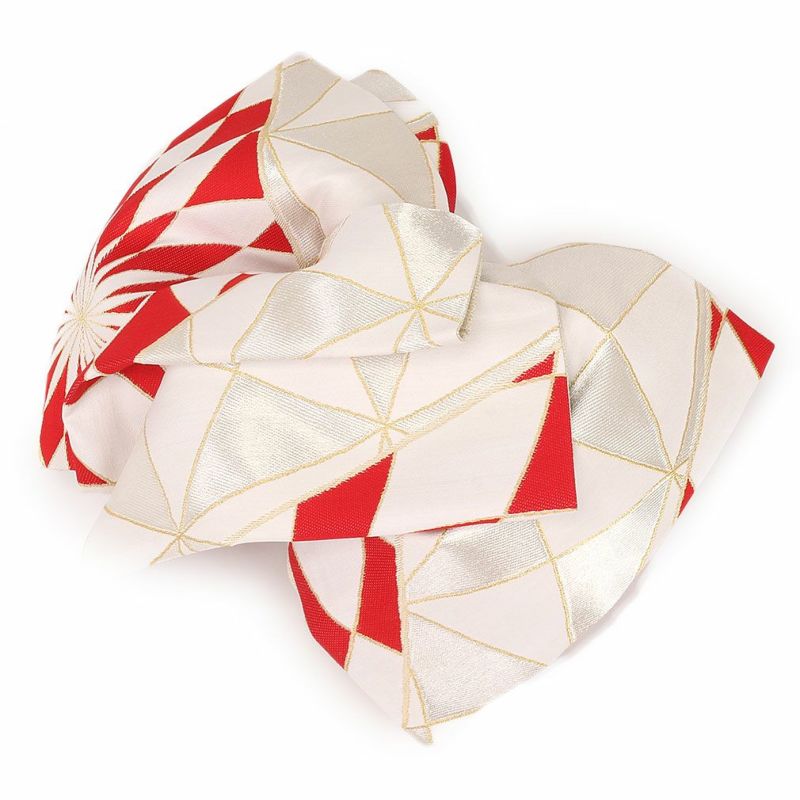 振袖にお使いいただける、西陣織お仕立て上り袋帯です。 華やかな色遣いの幾何学模様などが帯全体を彩られており、晴れの日にピッタリのデザインです。 帯は伝統工芸の西陣織にて仕立てられており、染められた糸を複雑に織って模様を作るので、完成までに多数の工程があり、とても手間暇がかかる高級絹織物です。 こうして丁寧に織られた生地は、先染めしてから織っているので、一般的な染色法の後染めより丈夫でシワになりにくいのが特徴です。 正絹の帯には、金糸をふんだんに使用しており、魅入ってしまうほどの美しい輝きが魅力的。 光の当たり方で、絹の柔らかな光沢や金糸が反射し、豪華絢爛な帯がお楽しみいただけます。 絹の質感と光沢、大胆で鮮麗な柄が、大切なお祝いの席を華やかに演出してくれるでしょう。 結婚式やパーティーでの振袖はもちろん、一度きりの成人式に相応しい豪華な逸品です。