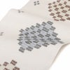 届いて直ぐに使える夏用のお仕立て上がりの袋帯です。 京都西陣で織り上げられ、西陣織の証紙が付いた品質確かな逸品。 絹糸で織られた本商品はしなやかな手触りで締め心地が良く、通気性も優れており初夏から初秋までご利用になれます。 爽やかな白の帯地に茶系・青系のモザイク菱の模様を織り込んだ上品な印象の袋帯です。 夏のお洒落訪問着や付け下げ、色無地など幅広くご利用いただけます。 上品で涼やかな夏のお着物にふさわしい袋帯。 ちょっとしたお出掛けにお勧めの商品です。 本商品はたれ先から前腹まで柄が織り込んでおりますので、帯結びが苦手な方にも結びやすく、着物初心者の方でも柄出しを気にせず気軽に結んでいただけます。
