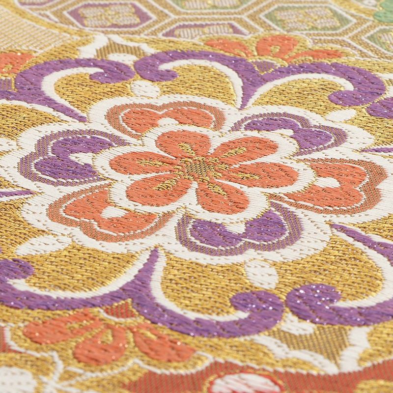 振袖にお使いいただける、西陣織お仕立て上り袋帯です。 煌びやかなゴールドの帯地に、色とりどりの花々が色彩豊かに描かれ帯元を華やかに演出します。 贅沢に使用された金糸の美しい輝きが帯周りを豪華に彩り、大切な日の振袖姿に華を添えます。 王道のスタイルからレトロ、モダンスタイルまで合わせやすく、様々なコーディネートがお楽しみいただけますよ。 帯は伝統工芸の西陣織にて仕立てられており、染められた糸を複雑に織って模様を作るので、完成までに多数の工程があり、とても手間暇がかかる高級絹織物です。 こうして丁寧に織られた生地は、先染めしてから織っているので、一般的な染色法の後染めより丈夫でシワになりにくいのが特徴です。 光の当たり方で、絹の柔らかな光沢が反射し、艶やかな帯がお楽しみいただけます。 絹の質感と光沢、大胆で鮮麗な柄が、大切なお祝いの席を華やかに演出してくれるでしょう。 結婚式やパーティーでの振袖はもちろん、一度きりの成人式に相応しい豪華な逸品です。