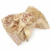 振袖にお使いいただける、西陣織お仕立て上り袋帯です。 落ち着いた色合いのベージュ地に煌めくゴールド・オレンジ・レッドなどで、蝶や華紋が大胆かつ繊細に描かれ帯元を華やかに演出します。 贅沢に使用された金糸の美しい輝きが帯周りを豪華に彩り、大切な日の振袖姿に華を添えます。 王道のスタイルからレトロ、モダンスタイルまで合わせやすく、様々なコーディネートがお楽しみいただけますよ。 帯は伝統工芸の西陣織にて仕立てられており、染められた糸を複雑に織って模様を作るので、完成までに多数の工程があり、とても手間暇がかかる高級絹織物です。 こうして丁寧に織られた生地は、先染めしてから織っているので、一般的な染色法の後染めより丈夫でシワになりにくいのが特徴です。 光の当たり方で、絹の柔らかな光沢が反射し、艶やかな帯がお楽しみいただけます。 絹の質感と光沢、大胆で鮮麗な柄が、大切なお祝いの席を華やかに演出してくれるでしょう。 結婚式やパーティーでの振袖はもちろん、一度きりの成人式に相応しい豪華な逸品です。