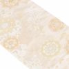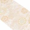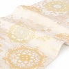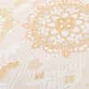 優しい色合いのシャンパンベージュの帯地に、煌めく金銀糸で華紋・吉祥文様などが繊細に織り込まれており、上品で華やかな印象を与えます。