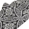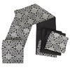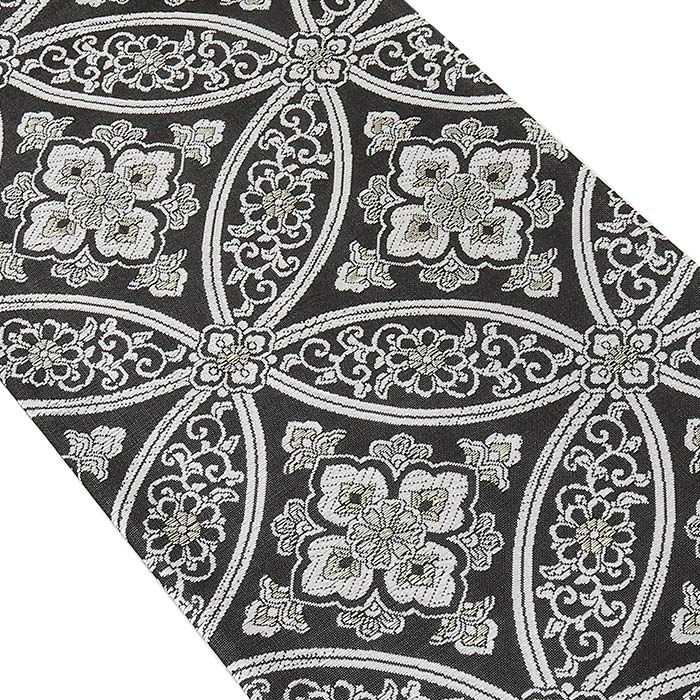 夏の結婚式の留袖や、訪問着などの礼装用にお使い頂ける、西陣織のお仕立て上がり夏袋帯です。 シックな黒地に白・シルバー・ゴールドを使って、七宝華紋が繊細に描かれた優美で上品な印象のデザインです。 帯は伝統工芸の西陣織にて仕立てられており、染められた糸を複雑に織って模様を作るので、完成までに多数の工程があり、とても手間暇がかかる高級絹織物です。 こうして丁寧に織られた生地は、先染めしてから織っているので、一般的な染色法の後染めより丈夫でシワになりにくいのが特徴です。 綿密に織られた西陣織は糸数も多く、ぐっと締まって緩みにくいので、着姿もしゃんと背筋が伸びます。 絹の帯には、金銀糸などを使用しており、魅入ってしまうほどの美しい輝きが魅力的。 光の当たり方で、絹特有の柔らかな光沢や金銀糸が反射し、高級感あふれる美しい帯がお楽しみいただけます。 どんなお色のお着物にも合わせやすく、コーディネート次第で様々なシーンへお出かけいただけます。 ご年代も選ばないので、お母さまとお嬢様で共有されても良いでしょう。 絹の質感と光沢、上品で絶佳なデザインが、大切なお祝いの席を華やかに演出します。 夏結婚式の黒留袖、色留袖を始め、訪問着など、初夏から盛夏、晩夏のフォーマルな装いにピッタリのおすすめの逸品です。