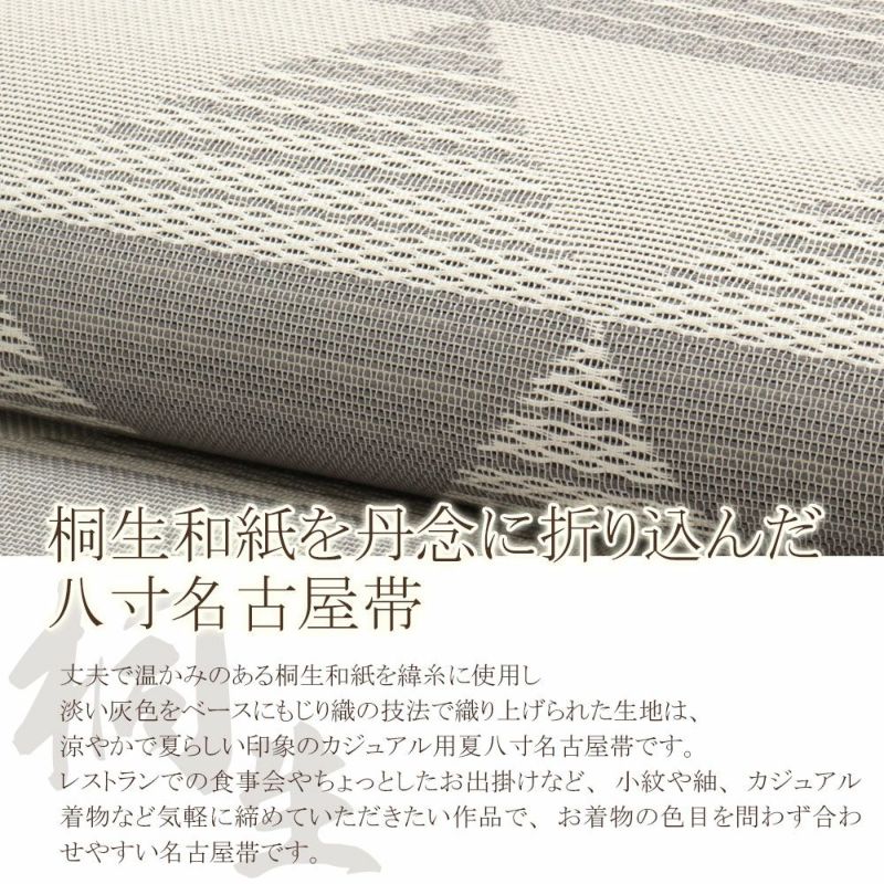 丈夫で温かみのある桐生和紙を緯糸に使用した『絹紙布』は、 細く切った桐生和紙でこよりを作りその糸を緯糸に使用し、もじり織の技法で丹念に織り上げられた、 涼やかで夏らしい印象のカジュアル用夏八寸名古屋帯です。