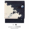 洋風モダンなデザインの「うれしづくし」シリーズの京袋帯です。 壮大な宇宙の中で宇宙飛行士がパズルを完成させていく、遊び心あふれるデザイン。 シンプルな着物も一気にイメージチェンジしてくれ、和にもモダンにも活躍します。 正絹なので手触りもよく、柔らかくて締めやすいので使い勝手も良いと、ご好評いただいています。 絹の艶やかな光沢が美しく光り、ポリエステルでは出ない高級感も感じさせてくれます。 こちらの京袋帯はすでにお仕立てが済んでいるので、届いたらすぐに使えるのも魅力の一つ。 全通柄の帯は、お太鼓の柄出しが苦手な方にも安心して締めていただけます。 ちょっと個性的なコーデを探している人に是非お勧めしたい商品です。
