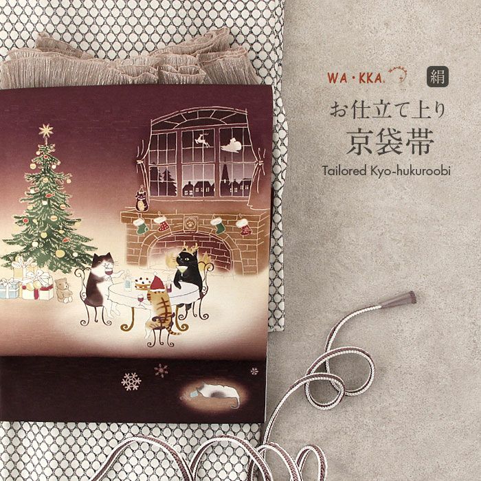「WA・KKA」は日々お出かけが楽しくなるきものを着て、色んなところにお出かけしてほしい!! という思いから生まれたブランドです。自分たちが実際に着てお出かけする目線で、きものまわりのものを作っています。 そんな和のお洒落を発信する京都のきものブランド「WA・KKA」の京袋帯です。 ホーリー☆ニャイト 今宵は仲良しニャンコのクリスマスパーティ!! ケーキにワインも用意してツリーも完璧、ちゃんと靴下だって吊ってサンタさんが来るのを待っています。 夜空を犬ソリで飛ぶねこサンタやソファーでくつろぐ可愛いニャンコたち、クリスマスの楽しい夜がデザインされています♪ 胴前の柄のデザインは諦め方によって使い分けが出来ます。 節の出る織り方が味わい深く、正絹ならではの光沢のある生地は、美しく染め上げられていて、高級感たっぷり。 正絹の染め帯なので非常に美しい発色で、絹特有の風合いと優しい手触が特徴です。 正絹の帯はポリエステルの帯と比べると締まり具合が非常に良く、着崩れ度合いが違います。 大胆で遊び心溢れるデザインはお出かけ先での注目の的間違いなし。 見る者の想像力を刺激する帯が貴女の着物ライフをもっと楽しくしてくれます。 小紋や紬の着物はもちろん、普段着物やウール、デニム着物等のカジュアルな着物に合わせてお楽しみください。