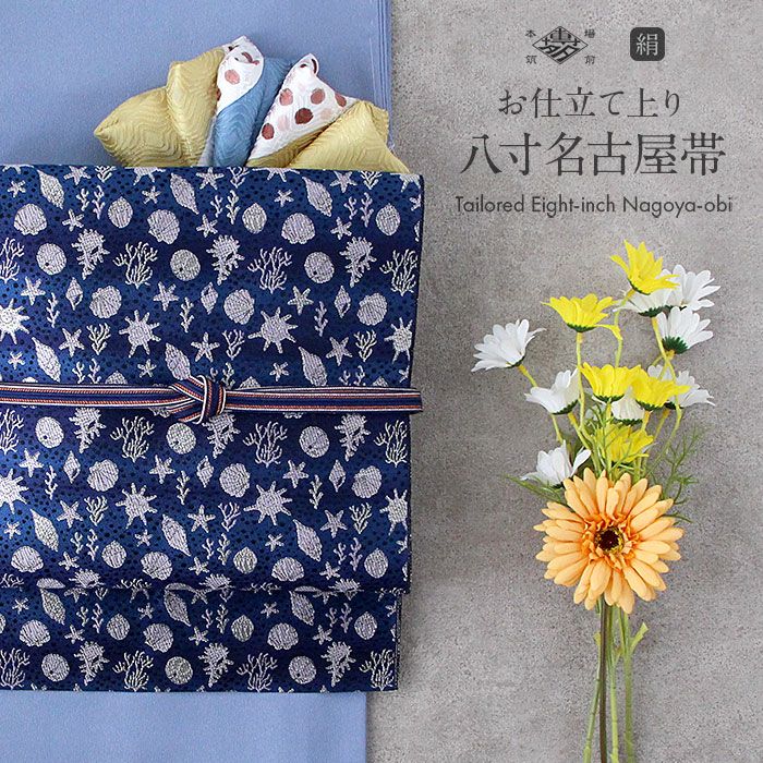 紺のグラデーション生地に、煌めく銀糸で貝殻などの海のモチーフが散りばめられたこの帯は、お洒落で爽やかなデザイン。