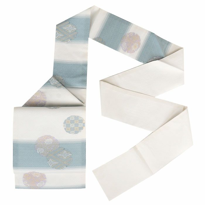 届いてすぐに使える、お仕立て上がりの夏名古屋帯です。 京都西陣で織り上げられた、西陣証紙のついた確かな品質。 爽やかな白と薄青の縞模様に、吉祥文様などの丸紋が描かれた、古典的でありながらモダンな雰囲気も持ち合わせたデザインです。 上品な帯ですのでコーディネートしやすく、 またさっくりとした涼し気な印象の帯ですので、初夏・盛夏・晩夏の小紋や紬、色無地、御召などの着物に最適です。 帯は伝統工芸の西陣織にて仕立てられており、染められた糸を複雑に織って模様を作るので、完成までに多数の工程があり、とても手間暇がかかる高級絹織物です。 こうして丁寧に織られた生地は、先染めしてから織っているので、一般的な染色法の後染めより丈夫でシワになりにくいのが特徴です。 絹の帯は何といっても柔らかな風合いで、高級感あふれる美しい帯の質感がお楽しみいただけます。 しなやかな手触りと締め心地の良さを兼ね備え、正絹特有の柔らかな光沢をもつ逸品です。 仕立てはお太鼓結びのしやすい名古屋仕立て。胴前がすでに半分に折られた状態ですので、帯結びが苦手な方でも締めやすく、お稽古事にも最適な帯です。 西陣織の意匠こもった深みのある柄行きが、後ろ姿のお太鼓も胴前も凛とした着姿を演出してくれるでしょう。 ぜひご自身の着物コーディネートに取り入れていただきたい名古屋帯です。