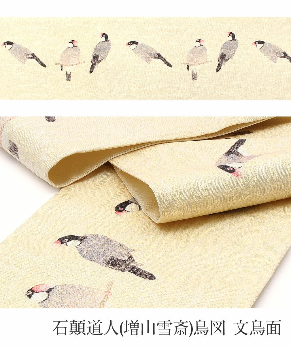 京都西陣の老舗である酒井守謹製のカジュアル半幅帯です。 江戸時代後期の伊勢国長島藩主でありながら、画家としても活躍した石顛道人(増山雪斎)「百鳥図」から文鳥を贅沢に帯に描きました。 桜色のくちばしが目を引く文鳥たちのかわいい仕草が描かれた帯は、小鳥好きにはもちろん見る人を楽しませ粋な着姿を演出します。 お洒落な柄が着姿を華やかに彩るリバーシブル小袋帯は、 裏側をちらりと見せてワンポイントにしてみたり、リボン結びで裏と表両方見せてみたり、 色々な結び方で着物姿を粋に演出することができます。 和アート柄がお好きな方はもちろん、粋な着こなしがお好きな方にも。 小紋や紬などの普段のお着物にあわせてみたり、注目を集めること間違いなしの1本です。