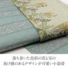 かわいらしく一点ごとに個性がキラリと光る召しませ花の半巾帯です。 お洒落な柄が着姿を華やかに彩る、リバーシブル小袋帯は、 裏側をちらりと見せてワンポイントにしてみたり、リボン結びで裏と表両方見せてみたり、 色々な結び方で着物姿を粋に演出することができます。 表面は、くすんだ黄色や緑などで植物の花や実が描かれたモダンなデザイン。 裏面は、緑がかった青のストライプにエキゾチックな模様があしらわれた上品で印象的な柄行。 絹とポリエステルを合わせて織り合わせており、しなやかな手触りと締め心地の良い逸品です。 丁寧に仕上げられた信頼のある日本製の帯は、仕立て上がりですので、お届け後すぐにお召しいただけます。 小紋や紬などの普段のお着物にあわせてみたり、注目を集めること間違いなしの1本です。 自由な帯結びで個性的なコーディネートがお楽しみいただけます。