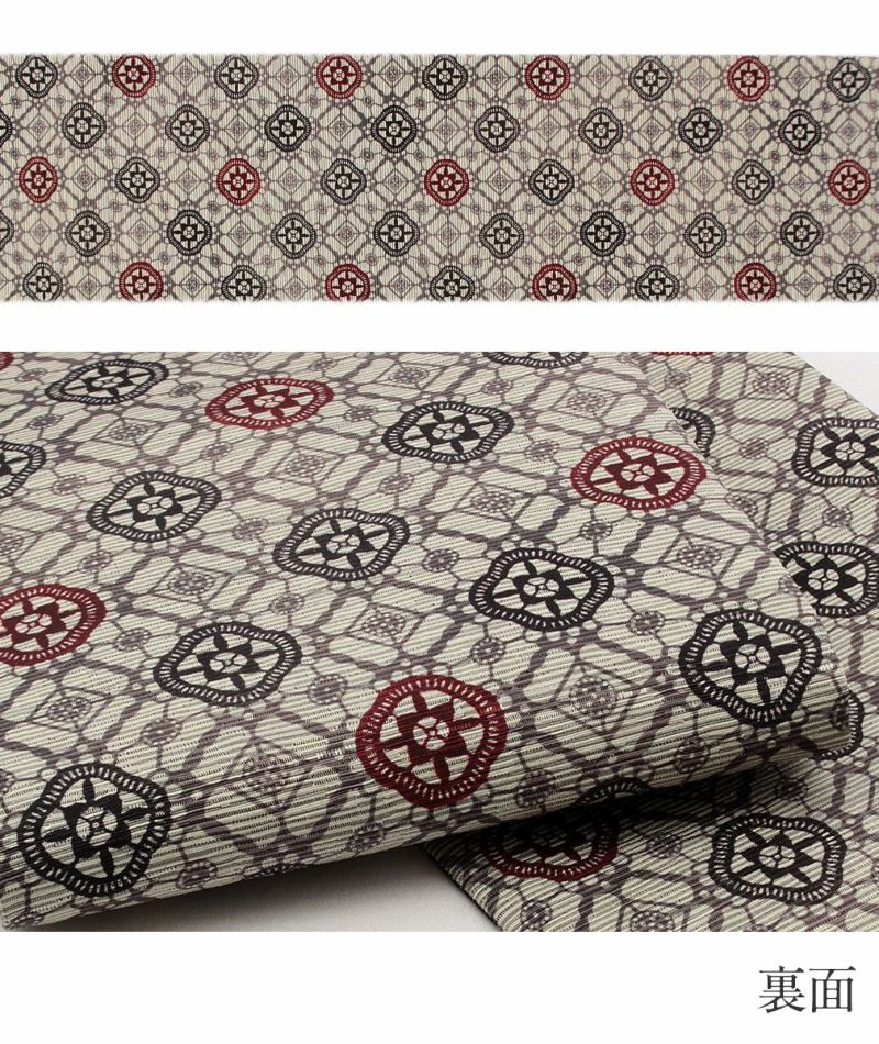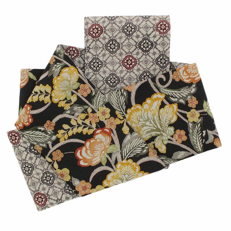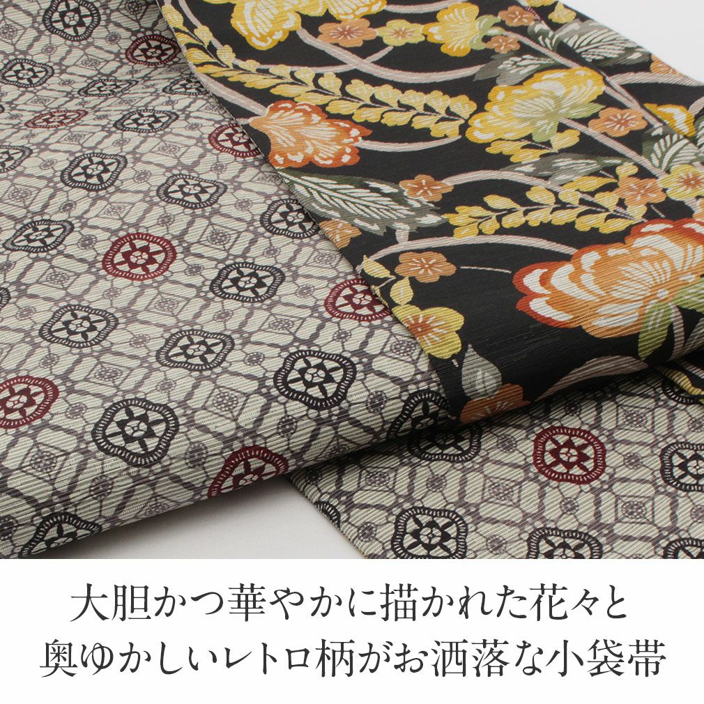かわいらしく一点ごとに個性がキラリと光る召しませ花の半巾帯です。 お洒落な柄が着姿を華やかに彩る、リバーシブル小袋帯は、 裏側をちらりと見せてワンポイントにしてみたり、リボン結びで裏と表両方見せてみたり、 色々な結び方で着物姿を粋に演出することができます。 表面は、黒地に黄色や橙の花々が鮮やかに描かれた華やかなデザイン。 裏面は、薄グレー地に雅で奥ゆかしいレトロな模様があしらわれた印象的な柄行。 絹とポリエステルを合わせて織り合わせており、しなやかな手触りと締め心地の良い逸品です。 丁寧に仕上げられた信頼のある日本製の帯は、仕立て上がりですので、お届け後すぐにお召しいただけます。 小紋や紬などの普段のお着物にあわせてみたり、注目を集めること間違いなしの1本です。 自由な帯結びで個性的なコーディネートがお楽しみいただけます。