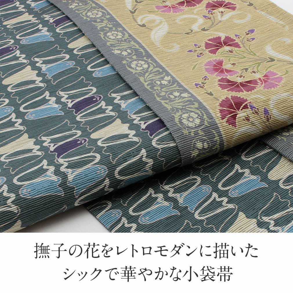 かわいらしく一点ごとに個性がキラリと光る召しませ花の半巾帯です。 お洒落な柄が着姿を華やかに彩る、リバーシブル小袋帯は、 裏側をちらりと見せてワンポイントにしてみたり、リボン結びで裏と表両方見せてみたり、 色々な結び方で着物姿を粋に演出することができます。 表面は、くすんだ黄色地に赤紫の撫子が描かれた色合いのコントラストが美しいデザイン。 裏面は、青みがかった緑地にカラフルな花房が並べられたお洒落な柄行。 絹とポリエステルを合わせて織り合わせており、しなやかな手触りと締め心地の良い逸品です。 丁寧に仕上げられた信頼のある日本製の帯は、仕立て上がりですので、お届け後すぐにお召しいただけます。 小紋や紬などの普段のお着物にあわせてみたり、注目を集めること間違いなしの1本です。 自由な帯結びで個性的なコーディネートがお楽しみいただけます。
