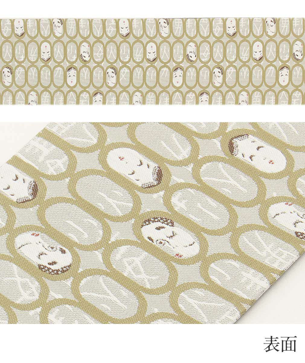 京都西陣の老舗である田中伝機業店謹製のカジュアル半幅帯をご用意致しました。 こちらの半幅帯は表地が西陣織、裏地がしじら織の高級感と実用性を兼ね備えた逸品です。 西陣織にて仕立てられた帯は、絹の艶やかな光沢が魅力的。 裏地は阿波しじら織の特徴であるシボがあることで肌触りがよく、汗をかいても肌に張りつかない 爽やかな締め心地です。 お洒落な柄が着姿を華やかに彩るリバーシブル小袋帯は、 裏側をちらりと見せてワンポイントにしてみたり、リボン結びで裏と表両方見せてみたり、 色々な結び方で着物姿を粋に演出することができます。 表地は、うぐいす色の生地におかめとひょっとこのお面柄が描かれており、ユーモラスで大人かっこいい印象です。 裏地は、黒地に縞柄がお洒落な小袋帯。 見る人を楽しませる魅力的な帯は、粋な着姿を演出します。 小紋や紬などのカジュアルな装いをはじめ、浴衣や街着など気軽に締めていただきたい逸品です。