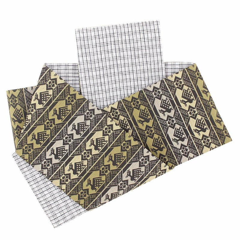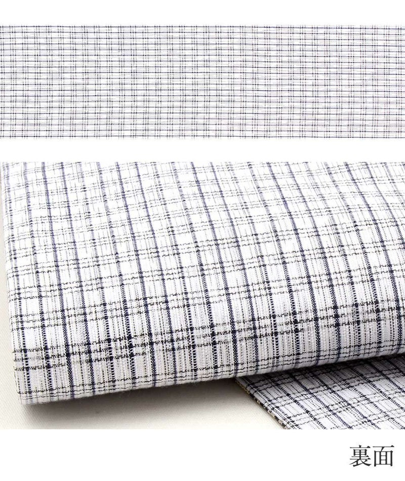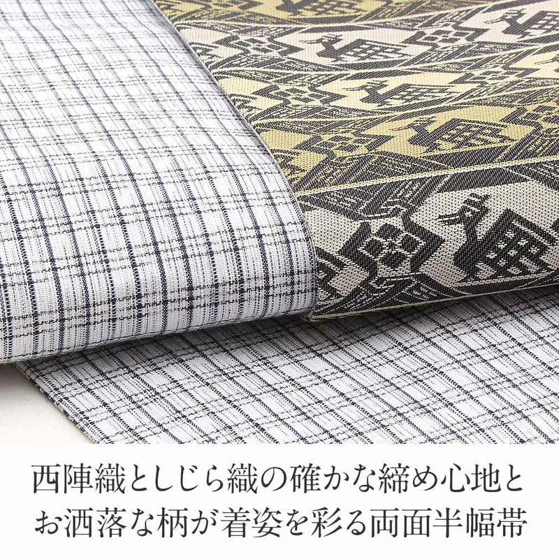 京都西陣の老舗である田中伝機業店謹製のカジュアル半幅帯をご用意致しました。 こちらの半幅帯は表地が西陣織、裏地がしじら織の高級感と実用性を兼ね備えた逸品です。 西陣織にて仕立てられた帯は、絹の艶やかな光沢が魅力的。 裏地は阿波しじら織の特徴であるシボがあることで肌触りがよく、汗をかいても肌に張りつかない 爽やかな締め心地です。 お洒落な柄が着姿を華やかに彩るリバーシブル小袋帯は、 裏側をちらりと見せてワンポイントにしてみたり、リボン結びで裏と表両方見せてみたり、 色々な結び方で着物姿を粋に演出することができます。 表地は、カーキ色と黒の生地に鳥が抽象柄で描かれており、スタイリッシュで大人かっこいい印象です。 裏地は、白地に格子柄がお洒落な小袋帯。 見る人を楽しませる魅力的な帯は、粋な着姿を演出します。 小紋や紬などのカジュアルな装いをはじめ、浴衣や街着など気軽に締めていただきたい逸品です。