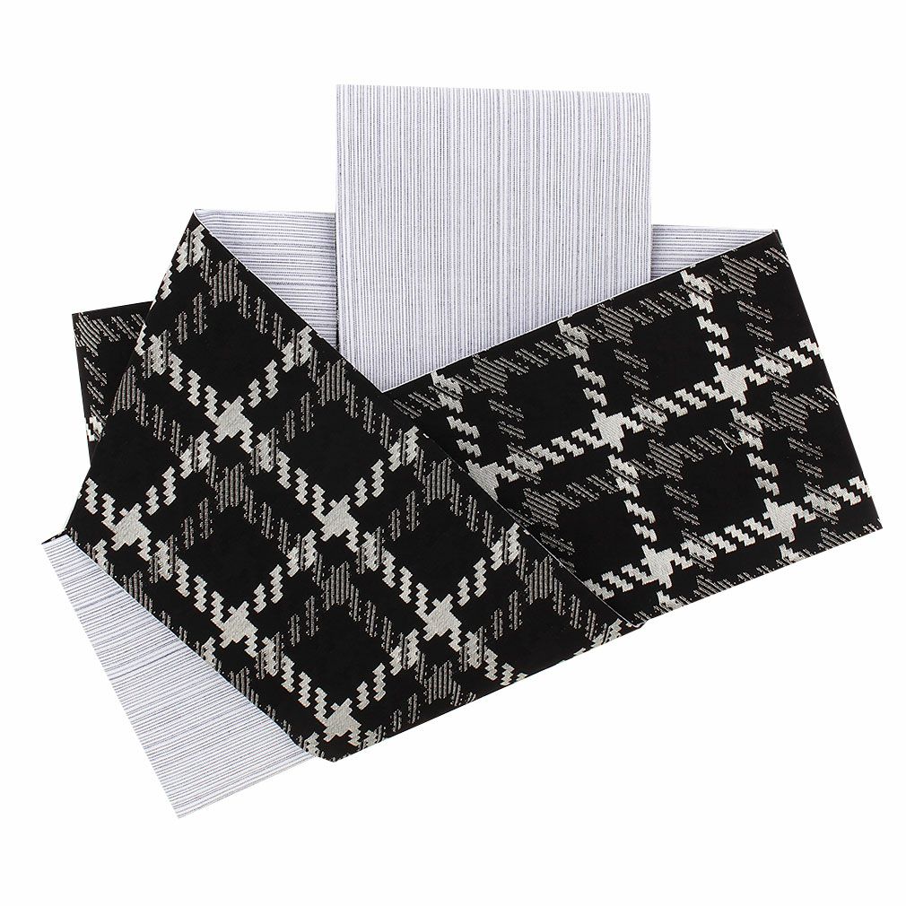 京都西陣の老舗である田中伝機業店謹製のカジュアル半幅帯をご用意致しました。 こちらの半幅帯は表地が西陣織、裏地がしじら織の高級感と実用性を兼ね備えた逸品です。 西陣織にて仕立てられた帯は、絹の上品な光沢が魅力的。 裏地は阿波しじら織の特徴であるシボがあることで肌触りがよく、汗をかいても肌に張りつかない 爽やかな締め心地です。 お洒落な柄が着姿を華やかに彩るリバーシブル小袋帯は、 裏側をちらりと見せてワンポイントにしてみたり、リボン結びで裏と表両方見せてみたり、 色々な結び方で着物姿を粋に演出することができます。 表地は、シックな黒の生地にシルバーで格子文様が描かれており、モダンでお洒落なデザインです。 裏地は、白地に黒の縞模様が粋な小袋帯。 見る人を楽しませる帯は、魅力的な着姿を演出します。 小紋や紬などのカジュアルな装いをはじめ、浴衣や街着など気軽に締めていただきたい逸品です。