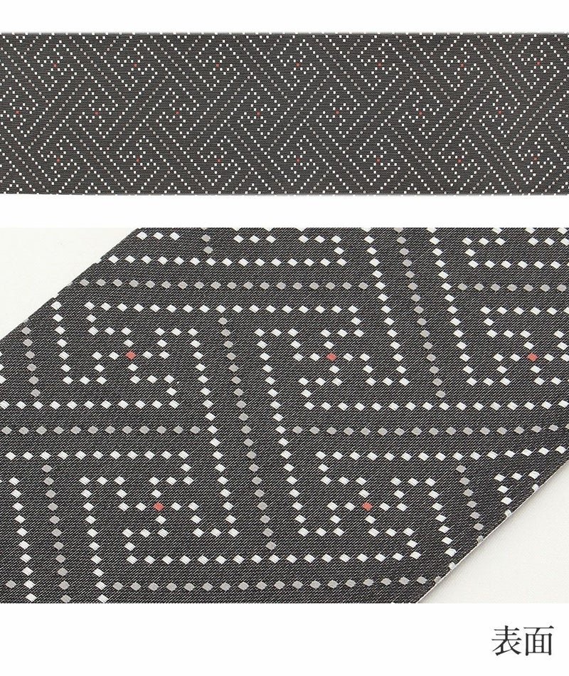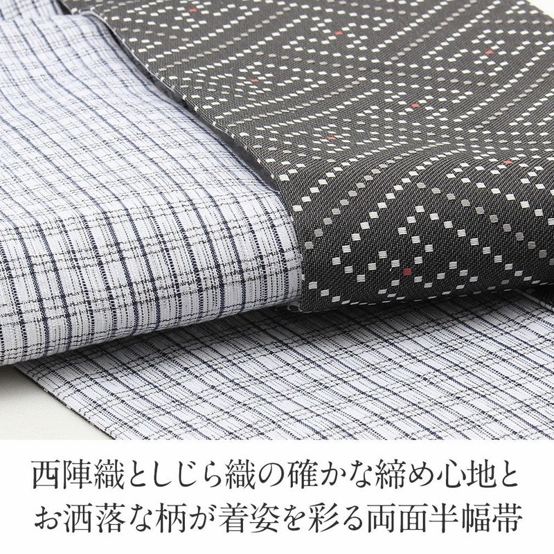 京都西陣の老舗である田中伝機業店謹製のカジュアル半幅帯をご用意致しました。 こちらの半幅帯は表地が西陣織、裏地がしじら織の高級感と実用性を兼ね備えた逸品です。 西陣織にて仕立てられた帯は、絹の上品な光沢が魅力的。 裏地は阿波しじら織の特徴であるシボがあることで肌触りがよく、汗をかいても肌に張りつかない 爽やかな締め心地です。 お洒落な柄が着姿を華やかに彩るリバーシブル小袋帯は、 裏側をちらりと見せてワンポイントにしてみたり、リボン結びで裏と表両方見せてみたり、 色々な結び方で着物姿を粋に演出することができます。 表地は、濃グレー地にドットで紗綾型文様が描かれた、レトロモダンでお洒落なデザインです。 裏地は、白地に紺の格子模様が粋な小袋帯。 見る人を楽しませる帯は、魅力的な着姿を演出します。 小紋や紬などのカジュアルな装いをはじめ、浴衣や街着など気軽に締めていただきたい逸品です。