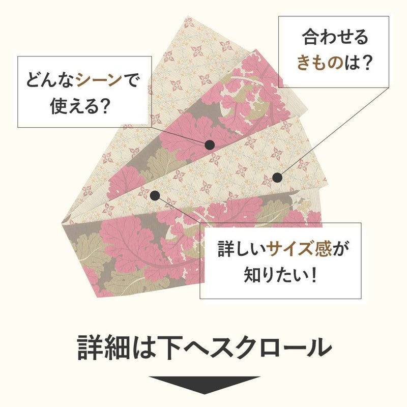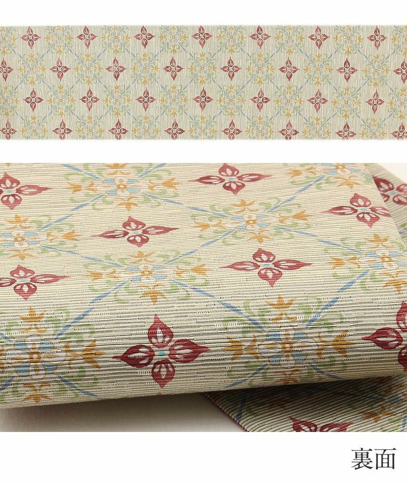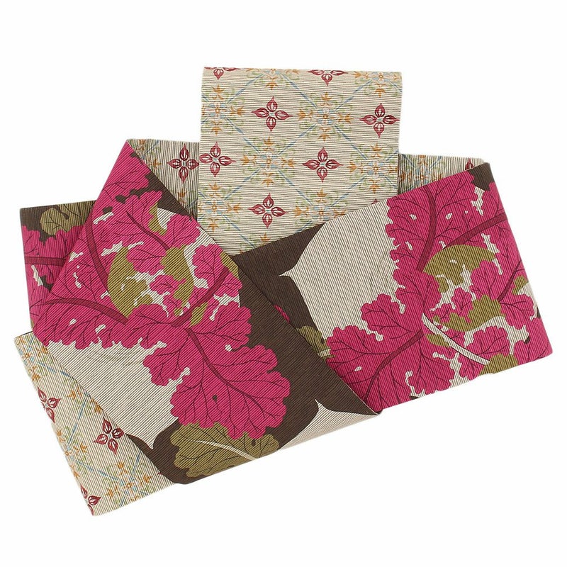 かわいらしく一点ごとに個性がキラリと光る召しませ花の半巾帯です。 お洒落な柄が着姿を華やかに彩る、リバーシブル小袋帯は、 裏側をちらりと見せてワンポイントにしてみたり、リボン結びで裏と表両方見せてみたり、 色々な結び方で着物姿を粋に演出することができます。 表面は、茶色地にカラフルな大きなかぶと、それを引っ張るネズミの絵柄が、可愛らしくお洒落な雰囲気。 裏面は、ベージュ地にアンティークな花模様がレトロで上品なデザイン。 絹とポリエステルを合わせて織り合わせており、しなやかな手触りと締め心地の良い逸品です。 丁寧に仕上げられた信頼のある日本製の帯は、仕立て上がりですので、お届け後すぐにお召しいただけます。 小紋や紬などの普段のお着物にあわせてみたり、注目を集めること間違いなしの1本です。 自由な帯結びで個性的なコーディネートがお楽しみいただけます。