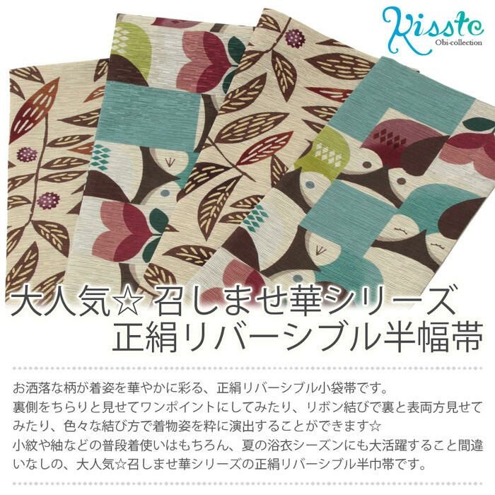 年中通して使えるのが嬉しい、通年用の 正絹半幅帯です。 柄を楽しんだり色で合わせたり、結び方を変えて何通りものコーディネートが楽しめるデザイン。 小紋や紬などの普段使いはもちろん、夏の浴衣シーズンにも大活躍すること間違いなしの、大人気☆召しませ華シリーズの正絹リバーシブル半巾帯です。