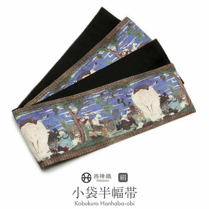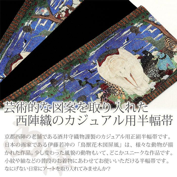 京都西陣の老舗である酒井守織物謹製の帯地を用いた小袋半幅帯です。 日本の画家である伊藤若冲の「鳥獣花木図屏風」は、様々な動物を独特な表現で描いた屏風画。 この絵画の技法である桝目描きは、なんでも帯の図案を考える下絵がもとになっているという説があるとのことなので、帯にはピッタリの作品といってもいいかもしれません。 そしてこの鮮やかな色彩は、華やかさと個性を引き立てること間違いなし! この帯を締めて、美術館巡りや城下散策・・・想像するだけでなんだかワクワクします。 織りだけでは表現できない細かな部分が描かれているのが、この「和アート」シリーズの帯の特徴。 なにげない日常にアートを取り入れてみませんか?