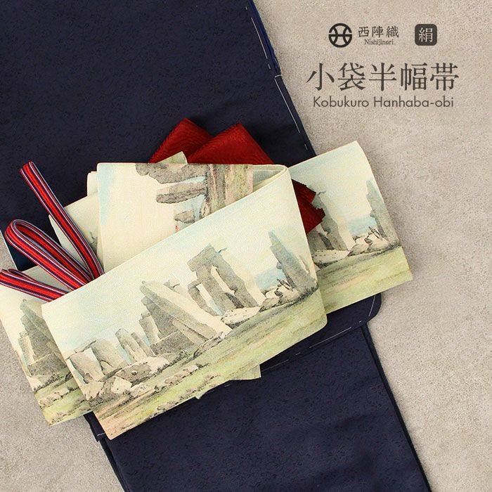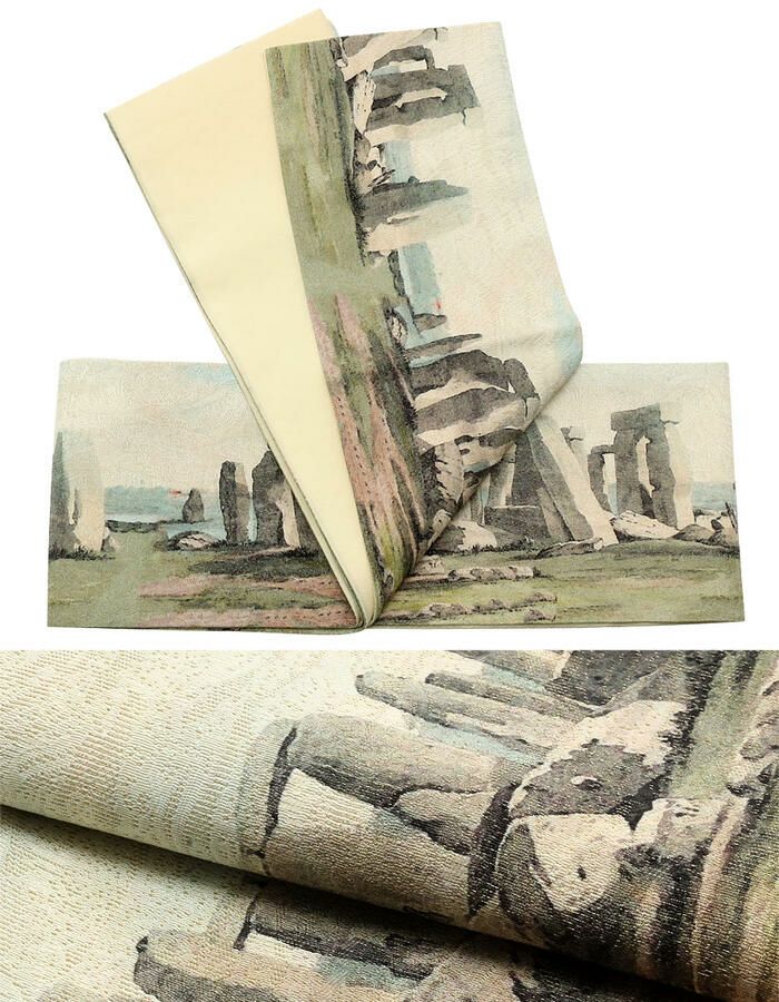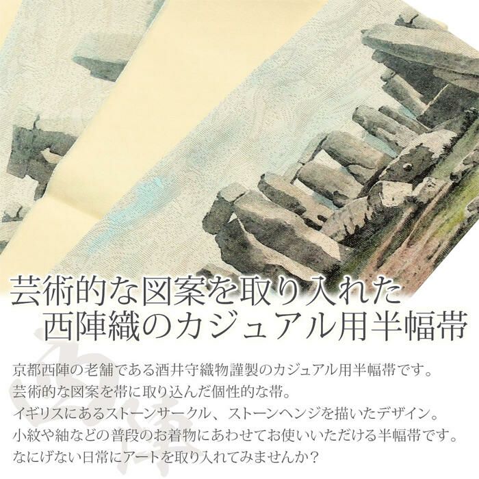 年中通して使えるのが嬉しい、通年用の半幅帯です。 京都西陣の老舗である酒井守織物謹製のカジュアル用半幅帯です。 芸術的な図案を帯に取り込んだ個性的な帯。 イギリスにあるストーンサークルであるストーンヘンジを描いたデザイン。 小紋や紬などの普段のお着物にあわせてお使いいただける半幅帯です。 なにげない日常にアートを取り入れてみませんか?