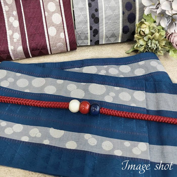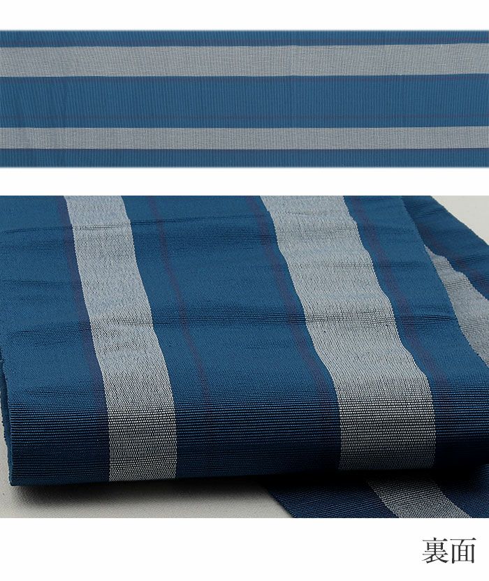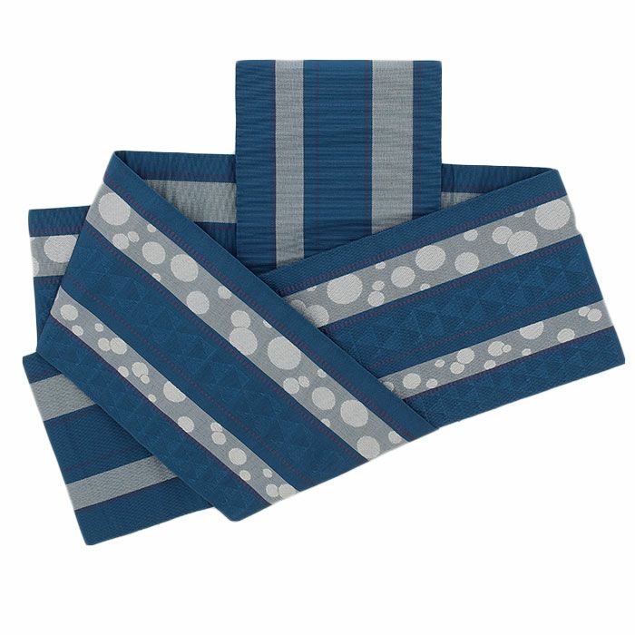 本場筑前博多織 小野織物の正絹半幅帯です。 その締め心地のよさから多くのきもの愛好家に好まれているお品です。 表は、青地に縞や鱗・水玉模様が描かれた、大人可愛いデザイン。 裏は、表と同じ色合いで縞模様が描かれたシンプルな文様。 絹糸で織り上げているため、通気性や吸湿性に優れ、季節を問わずお使いいただけます。 締め心地も気持ちがよく、「キュッ」とした絹鳴りが響くほど。締まりやすく緩まないのも博多帯ならではです。 しっかりと打ち込まれた緯糸が絹の光沢と生地のツヤ・ハリを持たせ、人と差がつく着姿を演出します。 気軽なお稽古事はもちろん、観劇、芸術鑑賞、ショッピング、ちょっとしたお出掛け等ご活用の幅も広いでしょう。 十分な長さがあるので、結び方によっても様々な表情を演出してくれます。 貝ノ口やかるた結びなどの小粋でスマートな帯結びから、三重仮紐を使ったボリュームのある変わり結びまで楽しめるのが半幅帯の魅力です。 1本増えるだけで着物コーディネートの楽しみがグッと広がる半幅帯、ぜひワードローブに加えてみてはいかがでしょうか。