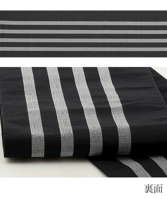 本場筑前博多織 小野織物の正絹半幅帯です。 その締め心地のよさから多くのきもの愛好家に好まれているお品です。 表は、黒地に縞や格子・波模様が描かれた、レトロモダンなデザイン。 裏は、黒にグレーの色合いで縞模様が描かれたシンプルな文様。 絹糸で織り上げているため、通気性や吸湿性に優れ、季節を問わずお使いいただけます。 締め心地も気持ちがよく、「キュッ」とした絹鳴りが響くほど。締まりやすく緩まないのも博多帯ならではです。 しっかりと打ち込まれた緯糸が絹の光沢と生地のツヤ・ハリを持たせ、人と差がつく着姿を演出します。 気軽なお稽古事はもちろん、観劇、芸術鑑賞、ショッピング、ちょっとしたお出掛け等ご活用の幅も広いでしょう。 十分な長さがあるので、結び方によっても様々な表情を演出してくれます。 貝ノ口やかるた結びなどの小粋でスマートな帯結びから、三重仮紐を使ったボリュームのある変わり結びまで楽しめるのが半幅帯の魅力です。 1本増えるだけで着物コーディネートの楽しみがグッと広がる半幅帯、ぜひワードローブに加えてみてはいかがでしょうか。