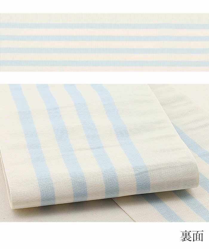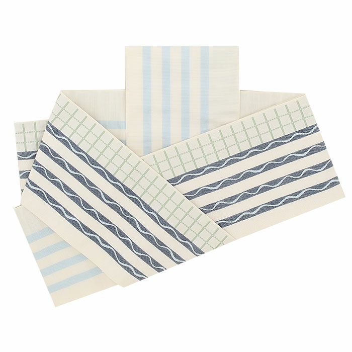 本場筑前博多織 小野織物の正絹半幅帯です。 その締め心地のよさから多くのきもの愛好家に好まれているお品です。 表は、白地に縞や格子・波模様が描かれた、レトロモダンなデザイン。 裏は、白に水色の色合いで縞模様が描かれたシンプルな文様。 絹糸で織り上げているため、通気性や吸湿性に優れ、季節を問わずお使いいただけます。 締め心地も気持ちがよく、「キュッ」とした絹鳴りが響くほど。締まりやすく緩まないのも博多帯ならではです。 しっかりと打ち込まれた緯糸が絹の光沢と生地のツヤ・ハリを持たせ、人と差がつく着姿を演出します。 気軽なお稽古事はもちろん、観劇、芸術鑑賞、ショッピング、ちょっとしたお出掛け等ご活用の幅も広いでしょう。 十分な長さがあるので、結び方によっても様々な表情を演出してくれます。 貝ノ口やかるた結びなどの小粋でスマートな帯結びから、三重仮紐を使ったボリュームのある変わり結びまで楽しめるのが半幅帯の魅力です。 1本増えるだけで着物コーディネートの楽しみがグッと広がる半幅帯、ぜひワードローブに加えてみてはいかがでしょうか。