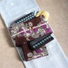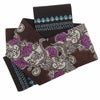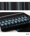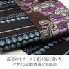 かわいらしく、一点ごとに個性がキラリと光る「召しませ花」のリバーシブル半幅帯です。 表面は、落ち着いた茶色に鮮やかな紫の花が映える、エレガントな動きのある更紗柄のデザイン。 裏面は、シックな黒地に青系で北欧の紋章を思わせるようなシンプルで上品な模様です。 両面どちらもおしゃれな柄で着姿を華やかに彩るリバーシブル小袋帯は、 裏側をちらりと見せてワンポイントにしてみたり、リボン結びで裏と表両方見せてみたり、 色々な結び方で着物姿を楽しく演出することができます。 柔らかな絹の生地をデジタル捺染プリントで柄付け。 織の帯では実現できないような細かく複雑な模様や繊細な色彩感も楽しんでいただけるのが特長です。 絹への染色は化繊や綿生地よりも色の出方も深みがあって高級さを感じられます。 柔らかな絹を質感を生かすため、とろみを感じられるような最も柔らかい帯芯を採用。 はんなりとした帯結びも楽しんでいただけます。 十分な長さがあり、リバーシブルで両面がおしゃれなので、出す柄や結び方によっても様々な表情を演出してくれます。 貝ノ口やかるた結びなどの小粋でスマートな帯結びから、三重仮紐を使ったボリュームのある変わり結びまで楽しめるのが半幅帯の魅力です。 1本増えるだけで着物コーディネートの楽しみがグッと広がる半幅帯、ぜひワードローブに加えてみてはいかがでしょうか。