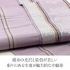 本場筑前博多織 小野織物の正絹半幅帯です。 本場筑前博多織は、その締め心地の良さから多くのきもの愛好家に愛されている逸品です。 表は、薄紫の帯地に紫陽花・縞模様が描かれた、上品でエレガントなデザイン。 裏は、同色地に4本のラインが入ったシンプルなデザインで、どちらも魅力的です。 絹糸で織り上げられているため、通気性や吸湿性に優れ、季節を問わず快適にお使いいただけます。 締め心地も抜群で、「キュッ」とした絹鳴りが響くほどの締まりやすさと緩まない特性は、博多帯ならではの魅力です。 しっかりと打ち込まれた緯糸が絹の光沢と生地のツヤ・ハリを持たせ、人と差がつく着姿を演出します。 気軽なお稽古事はもちろん、観劇、芸術鑑賞、ショッピング、ちょっとしたお出掛けなど、幅広いシーンでご活用いただけます。 十分な長さがあり、結び方によって様々な表情を演出できるのも魅力の一つです。 貝ノ口やかるた結びなどの小粋でスマートな帯結びから、三重仮紐を使ったボリュームのある変わり結びまで楽しめる半幅帯は、1本増えるだけで着物コーディネートの楽しみがグッと広がります。 ぜひ、この素敵な半幅帯をワードローブに加えて、着物ライフをさらに充実させてみませんか?