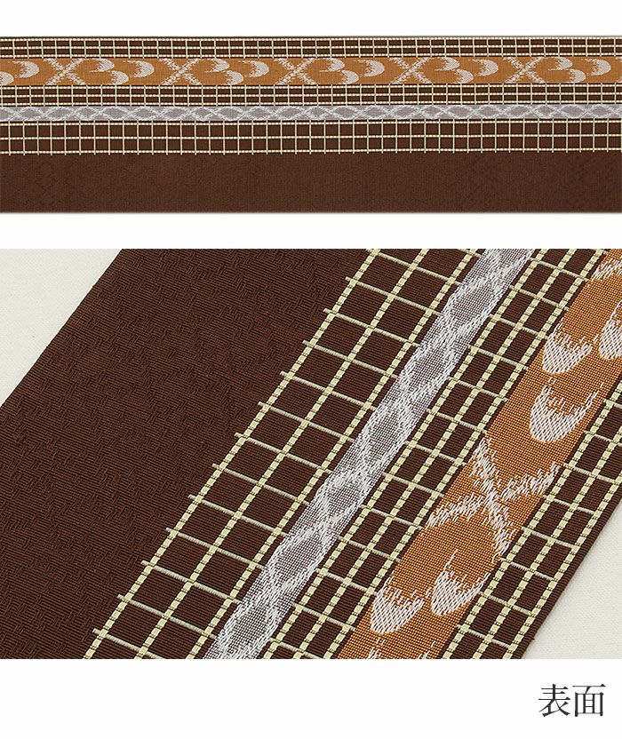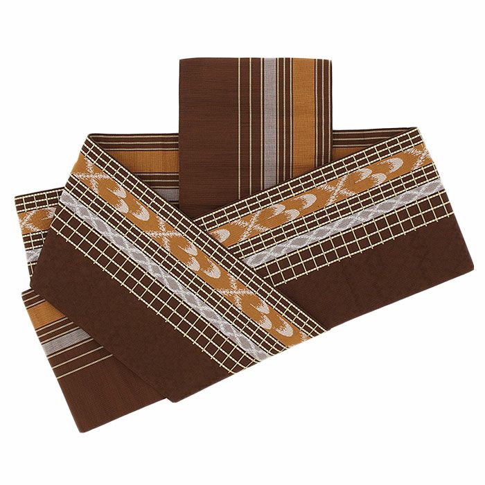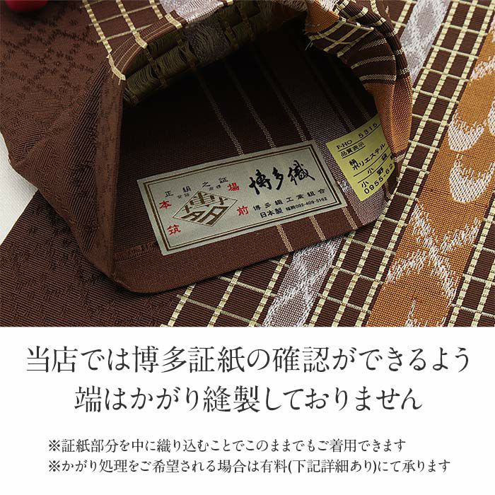 本場筑前博多織 小野織物の正絹半幅帯です。 本場筑前博多織は、その締め心地の良さから多くのきもの愛好家に愛されている逸品です。 表は、落ち着いた茶色の帯地に格子柄などが描かれた、上品なデザイン。 裏は、同色地に縞模様が入ったシンプルなデザインで、どちらも魅力的です。 絹糸で織り上げられているため、通気性や吸湿性に優れ、季節を問わず快適にお使いいただけます。 締め心地も抜群で、「キュッ」とした絹鳴りが響くほどの締まりやすさと緩まない特性は、博多帯ならではの魅力です。 しっかりと打ち込まれた緯糸が絹の光沢と生地のツヤ・ハリを持たせ、人と差がつく着姿を演出します。 気軽なお稽古事はもちろん、観劇、芸術鑑賞、ショッピング、ちょっとしたお出掛けなど、幅広いシーンでご活用いただけます。 十分な長さがあり、結び方によって様々な表情を演出できるのも魅力の一つです。 貝ノ口やかるた結びなどの小粋でスマートな帯結びから、三重仮紐を使ったボリュームのある変わり結びまで楽しめる半幅帯は、1本増えるだけで着物コーディネートの楽しみがグッと広がります。 ぜひ、この素敵な半幅帯をワードローブに加えて、着物ライフをさらに充実させてみませんか?
