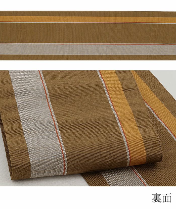 本場筑前博多織 小野織物の正絹半幅帯です。 本場筑前博多織は、その締め心地のよさから多くのきもの愛好家に好まれているお品です。 ■表は、黄味よりの茶色地に奥ゆかしい同色の椿が浮かび、緑・薄茶・橙の矢羽模様が彩りを添えます。 ■裏は、同色地のシンプルなデザインで、どちらも魅力的です。 絹糸で織り上げられているため、通気性や吸湿性に優れ、季節を問わず快適にお使いいただけます。 締め心地も抜群で、「キュッ」とした絹鳴りが響くほどの締まりやすさと緩まない特性は、博多帯ならではの魅力です。 しっかりと打ち込まれた緯糸が絹の光沢と生地のツヤ・ハリを持たせ、人と差がつく着姿を演出します。 お稽古事はもちろん、観劇、芸術鑑賞、ショッピング、ちょっとしたお出掛け等ご活用の幅も広いでしょう。 適度に長さがあり、結び方によって様々な表情を演出できるのも魅力の一つです。 貝ノ口やかるた結びなどの小粋でスマートな帯結びから、三重仮紐を使ったボリュームのある変わり結びまで楽しめる半幅帯は、1本増えるだけで着物コーディネートの楽しみがグッと広がります。 ぜひ、この素敵な半幅帯をワードローブに加えて、着物ライフをさらに充実させてみませんか?