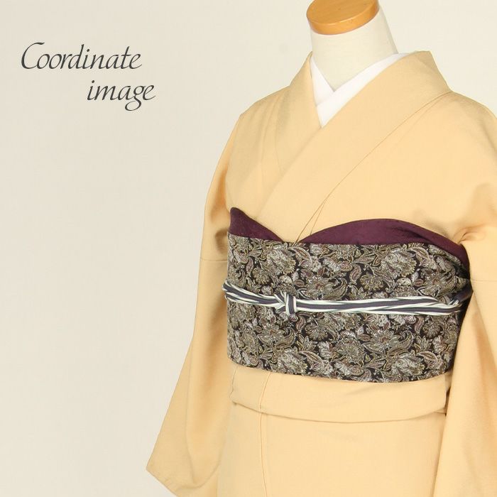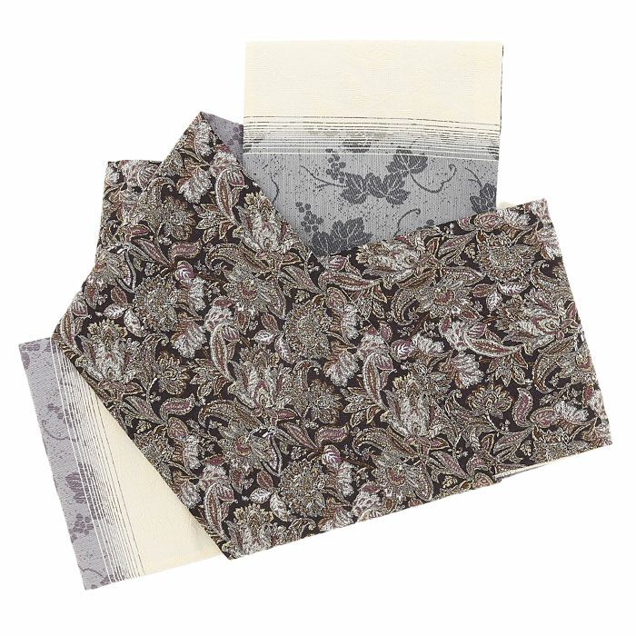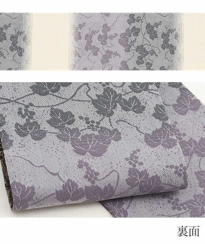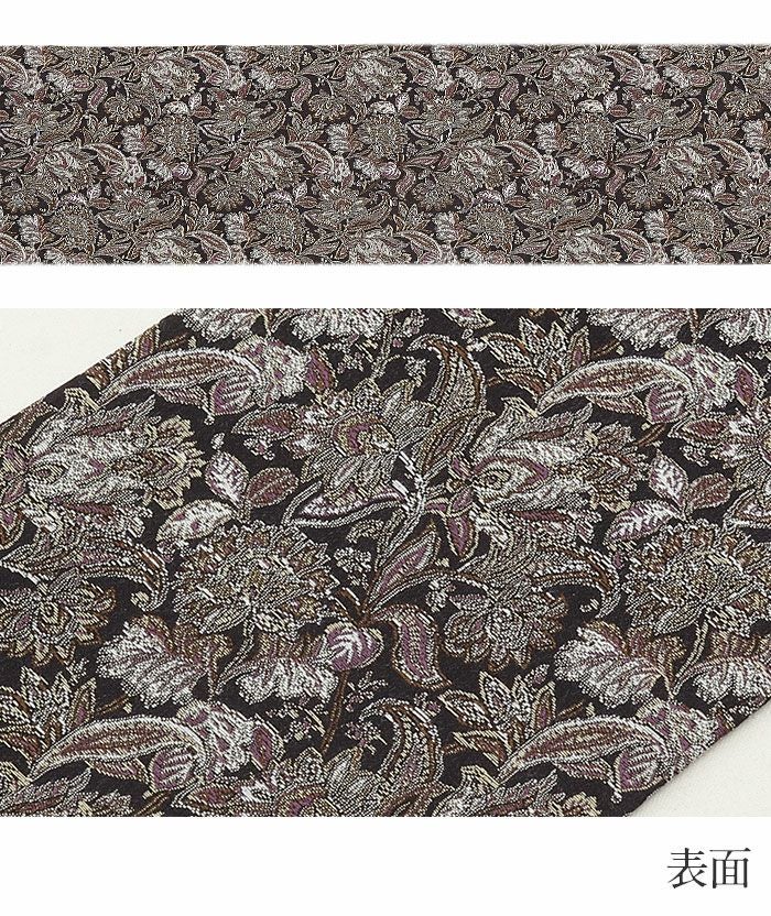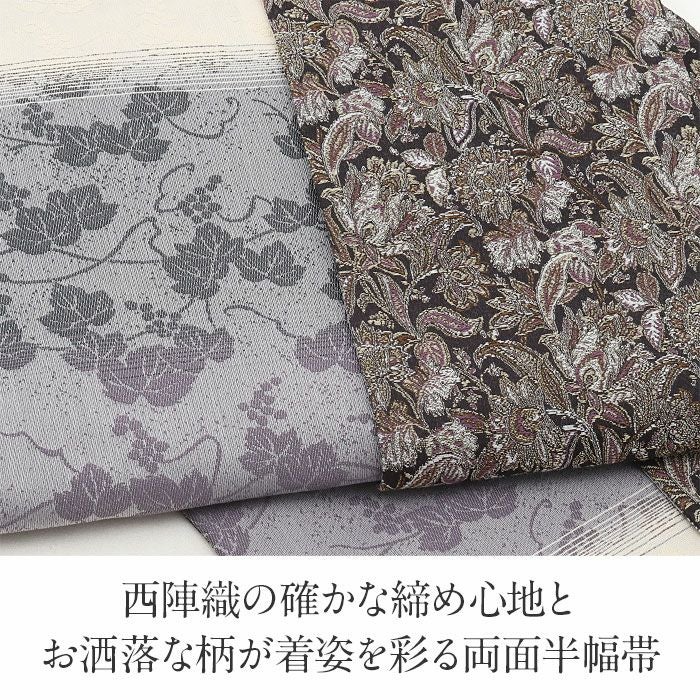 西陣織の名門・大光織物が丹精こめて織り上げた、風格あるリバーシブル半幅帯です。 繊細で緻密な織りの美しさに加え、アレンジしやすい長尺仕様で、日常の装いから特別な日のコーディネートまで幅広く活躍する一本です。 ■表面は、シックな黒地にペイズリー柄が細やかに織り出され、控えめな光沢が着姿に上品な格調を添えています。 ■裏面は、縞模様に葡萄の柄があしらわれ、色の切り替えが奥行きのある美しさを生み出します。 両面とも上質感あふれる意匠のため、その日の気分や着物に合わせて雰囲気の異なるコーディネートを楽しめるのが魅力です。 ■長さはゆとりのある長尺タイプ。 ふくら雀、文庫、変わり文庫、リボン結びなど、長さをいかした華やかな帯結びが美しく決まり、後ろ姿をいっそう印象的に仕上げてくれます。 リバーシブル仕様のため、どちらの柄を見せるか、結び方をどう変えるかによって、多彩な表情を生み出せるのも嬉しいポイントです。 本品は伝統工芸である西陣織によって仕立てられ、色糸を先に染めてから緻密に織り上げることで模様を作り出すため、完成までに多くの工程と高度な技術を要する高級絹織物です。 先染めならではの丈夫さやシワになりにくい性質を持ち、しっかりとした張りがあるため、美しい帯結びを長時間保ちやすいのも特長です。 一本加わるだけで装いの幅がぐっと広がる半幅帯。ぜひワードローブに取り入れて、着物コーディネートをより一層お楽しみください。
