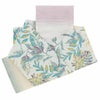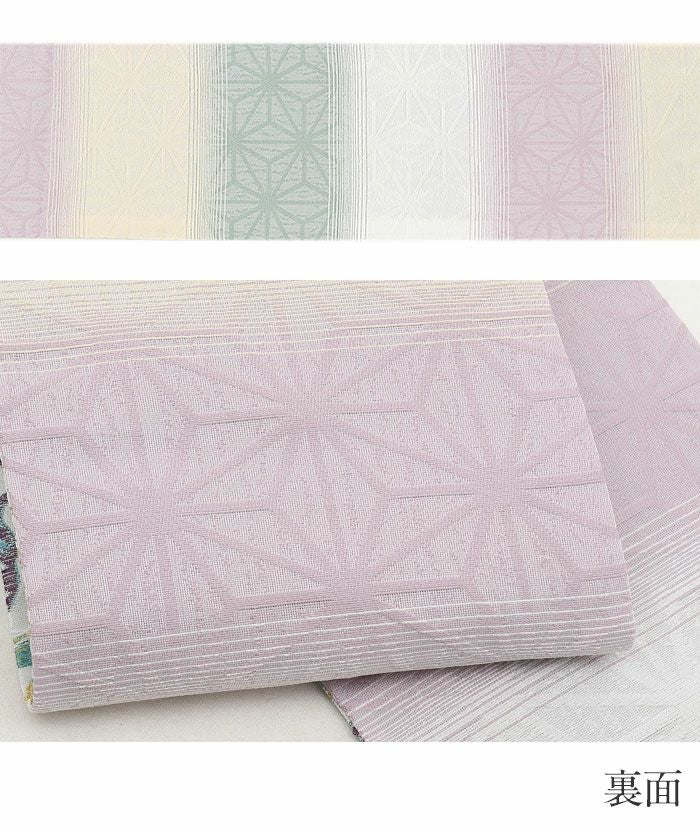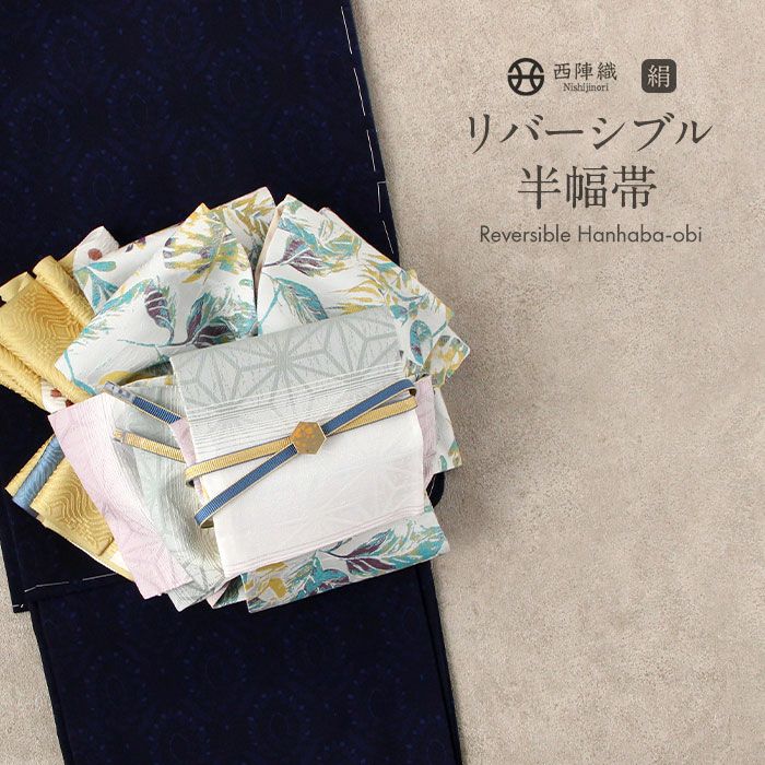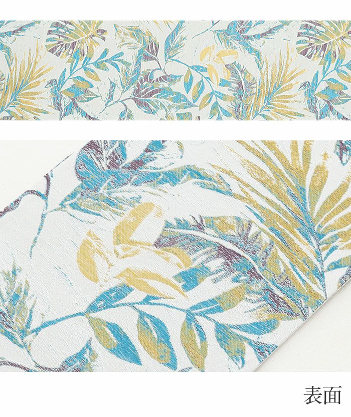 西陣織の名門・大光織物が丹精こめて織り上げた、風格あるリバーシブル半幅帯です。 繊細で緻密な織りの美しさに加え、アレンジしやすい長尺仕様で、日常の装いから特別な日のコーディネートまで幅広く活躍する一本です。 ■表面は、上品な薄グレー地にカラフルなモンステラ柄が施され、爽やかさと遊び心が同時に感じられる、明るくモダンな印象のデザイン。 ■裏面は、優しい色合いの縞模様に麻の葉文様があしらわれ、色の切り替えが奥行きのある美しさを生み出します。 両面とも上質感あふれる意匠のため、その日の気分や着物に合わせて雰囲気の異なるコーディネートを楽しめるのが魅力です。 ■長さはゆとりのある長尺タイプ。 ふくら雀、文庫、変わり文庫、リボン結びなど、長さをいかした華やかな帯結びが美しく決まり、後ろ姿をいっそう印象的に仕上げてくれます。 リバーシブル仕様のため、どちらの柄を見せるか、結び方をどう変えるかによって、多彩な表情を生み出せるのも嬉しいポイントです。 本品は伝統工芸である西陣織によって仕立てられ、色糸を先に染めてから緻密に織り上げることで模様を作り出すため、完成までに多くの工程と高度な技術を要する高級絹織物です。 先染めならではの丈夫さやシワになりにくい性質を持ち、しっかりとした張りがあるため、美しい帯結びを長時間保ちやすいのも特長です。 一本加わるだけで装いの幅がぐっと広がる半幅帯。ぜひワードローブに取り入れて、着物コーディネートをより一層お楽しみください。