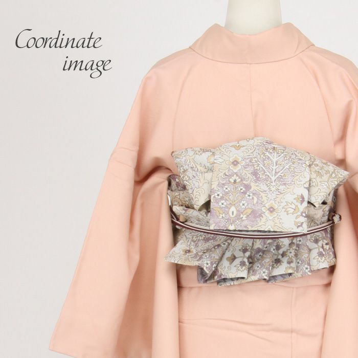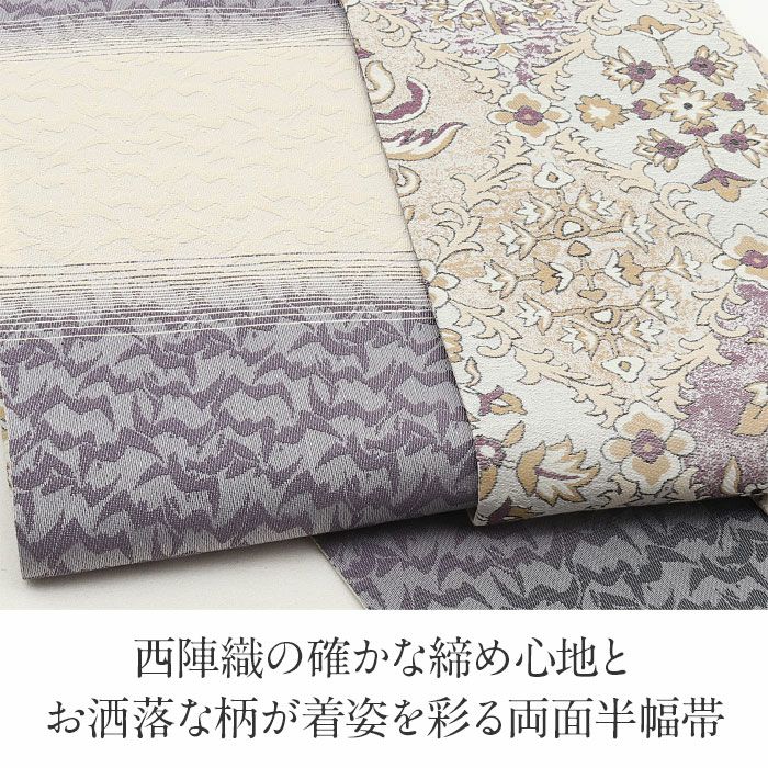 西陣織の名門・大光織物が丹精こめて織り上げた、風格あるリバーシブル半幅帯です。 繊細で緻密な織りの美しさに加え、アレンジしやすい長尺仕様で、日常の装いから特別な日のコーディネートまで幅広く活躍する一本です。 ■表面は、上品なベージュ・紫・薄グレーに花更紗文様が施され、細やかな模様がアンティーク調のクラシックな魅力とエキゾチックな華やかさを引き立てます。 ■裏面は、波が揺れるようなモチーフを取り入れたモダンな縞柄があしらわれ、落ち着いた色の切り替えが奥行きのある美しさを生み出します。 両面とも上質感あふれる意匠のため、その日の気分や着物に合わせて雰囲気の異なるコーディネートを楽しめるのが魅力です。 ■長さはゆとりのある長尺タイプ。 ふくら雀、文庫、変わり文庫、リボン結びなど、長さをいかした華やかな帯結びが美しく決まり、後ろ姿をいっそう印象的に仕上げてくれます。 リバーシブル仕様のため、どちらの柄を見せるか、結び方をどう変えるかによって、多彩な表情を生み出せるのも嬉しいポイントです。 本品は伝統工芸である西陣織によって仕立てられ、色糸を先に染めてから緻密に織り上げることで模様を作り出すため、完成までに多くの工程と高度な技術を要する高級絹織物です。 先染めならではの丈夫さやシワになりにくい性質を持ち、しっかりとした張りがあるため、美しい帯結びを長時間保ちやすいのも特長です。 一本加わるだけで装いの幅がぐっと広がる半幅帯。ぜひワードローブに取り入れて、着物コーディネートをより一層お楽しみください。