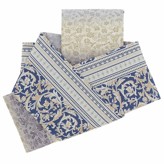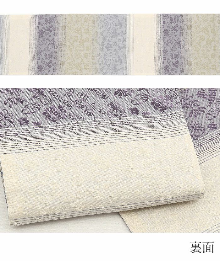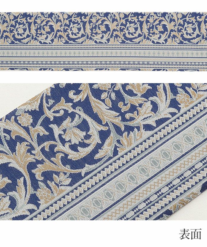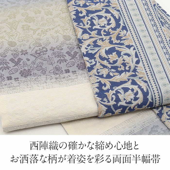 西陣織の名門・大光織物が丹精こめて織り上げた、風格あるリバーシブル半幅帯です。 繊細で緻密な織りの美しさに加え、アレンジしやすい長尺仕様で、日常の装いから特別な日のコーディネートまで幅広く活躍する一本です。 ■表面は、落ち着いた青を基調に、カラシ色や淡い緑が織り成す唐草が、クラシックで優雅な雰囲気を添えています。 ■裏面は、草花や吉祥モチーフを取り入れた古典的な縞柄があしらわれ、色の切り替えが奥行きのある美しさを生み出します。 両面とも上質感あふれる意匠のため、その日の気分や着物に合わせて雰囲気の異なるコーディネートを楽しめるのが魅力です。 ■長さはゆとりのある長尺タイプ。 ふくら雀、文庫、変わり文庫、リボン結びなど、長さをいかした華やかな帯結びが美しく決まり、後ろ姿をいっそう印象的に仕上げてくれます。 リバーシブル仕様のため、どちらの柄を見せるか、結び方をどう変えるかによって、多彩な表情を生み出せるのも嬉しいポイントです。 本品は伝統工芸である西陣織によって仕立てられ、色糸を先に染めてから緻密に織り上げることで模様を作り出すため、完成までに多くの工程と高度な技術を要する高級絹織物です。 先染めならではの丈夫さやシワになりにくい性質を持ち、しっかりとした張りがあるため、美しい帯結びを長時間保ちやすいのも特長です。 一本加わるだけで装いの幅がぐっと広がる半幅帯。ぜひワードローブに取り入れて、着物コーディネートをより一層お楽しみください。