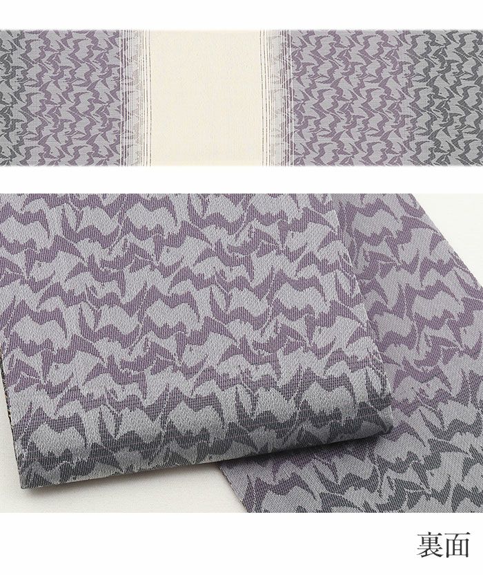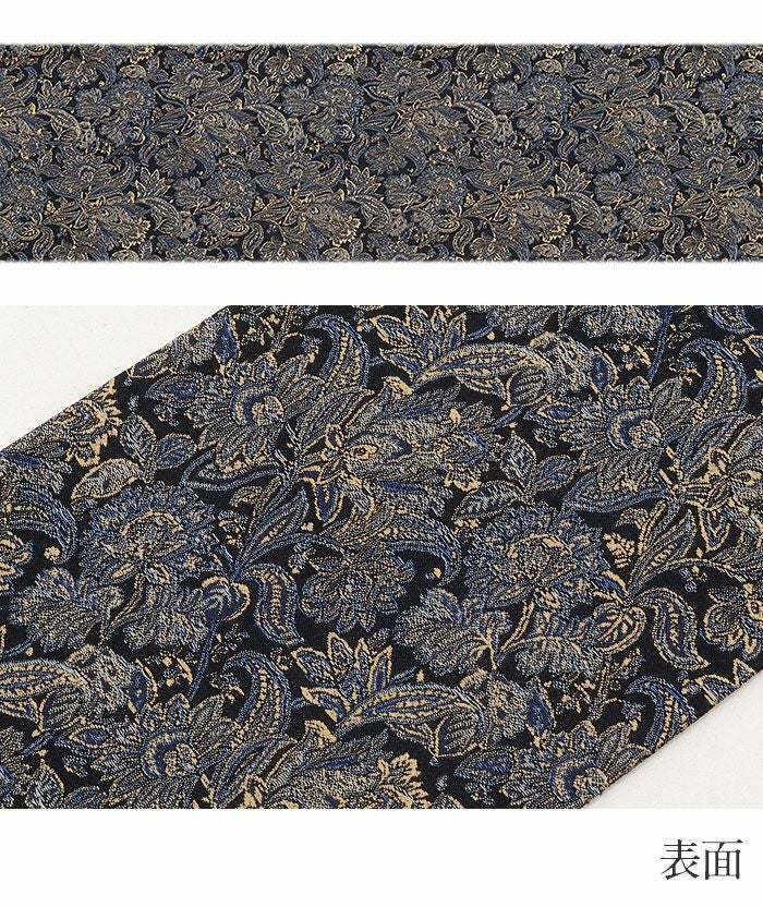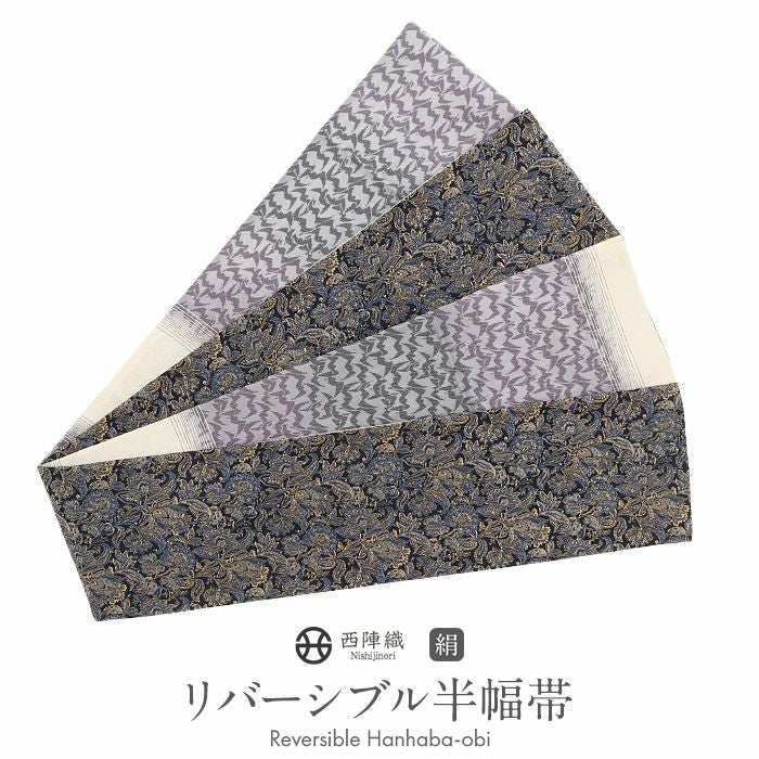 西陣織の名門・大光織物が丹精こめて織り上げた、風格あるリバーシブル半幅帯です。 繊細で緻密な織りの美しさに加え、アレンジしやすい長尺仕様で、日常の装いから特別な日のコーディネートまで幅広く活躍する一本です。 ■表面は、シックな黒地にペイズリー柄が細やかに織り出され、控えめな光沢が着姿に上品な格調を添えています。 ■裏面は、波が揺れるようなモチーフを取り入れたモダンな縞柄があしらわれ、落ち着いた色の切り替えが奥行きのある美しさを生み出します。 両面とも上質感あふれる意匠のため、その日の気分や着物に合わせて雰囲気の異なるコーディネートを楽しめるのが魅力です。 ■長さはゆとりのある長尺タイプ。 ふくら雀、文庫、変わり文庫、リボン結びなど、長さをいかした華やかな帯結びが美しく決まり、後ろ姿をいっそう印象的に仕上げてくれます。 リバーシブル仕様のため、どちらの柄を見せるか、結び方をどう変えるかによって、多彩な表情を生み出せるのも嬉しいポイントです。 本品は伝統工芸である西陣織によって仕立てられ、色糸を先に染めてから緻密に織り上げることで模様を作り出すため、完成までに多くの工程と高度な技術を要する高級絹織物です。 先染めならではの丈夫さやシワになりにくい性質を持ち、しっかりとした張りがあるため、美しい帯結びを長時間保ちやすいのも特長です。 一本加わるだけで装いの幅がぐっと広がる半幅帯。ぜひワードローブに取り入れて、着物コーディネートをより一層お楽しみください。