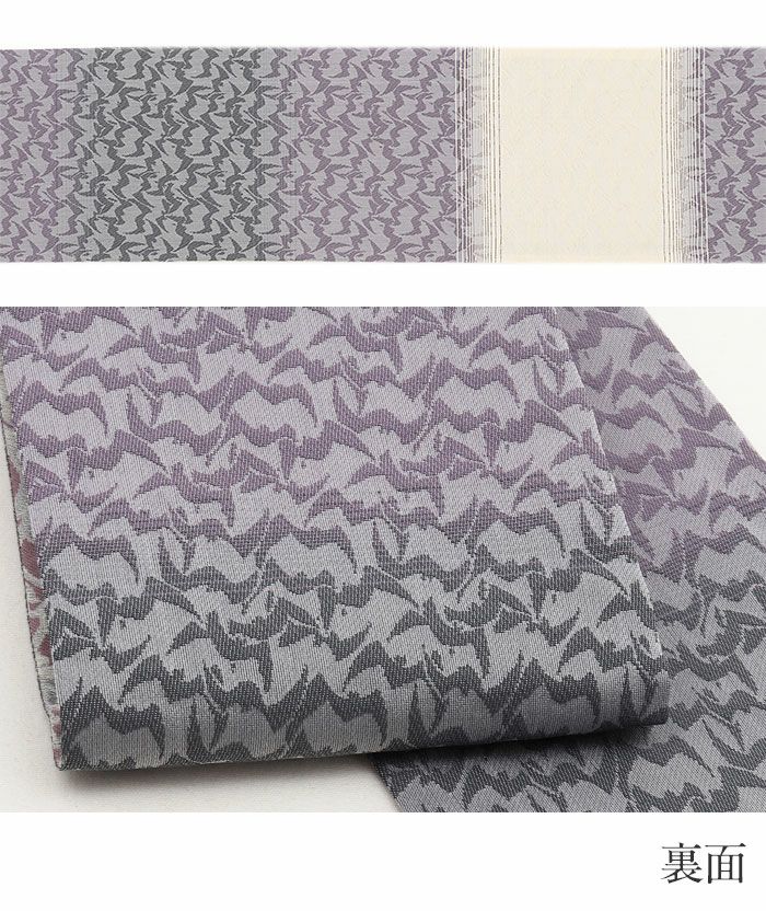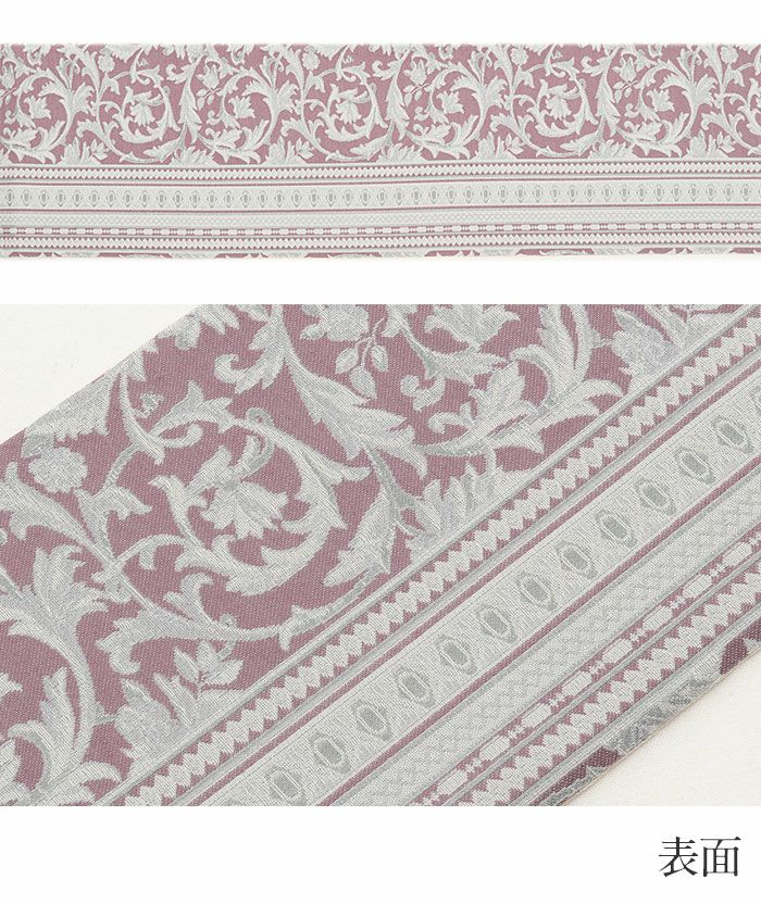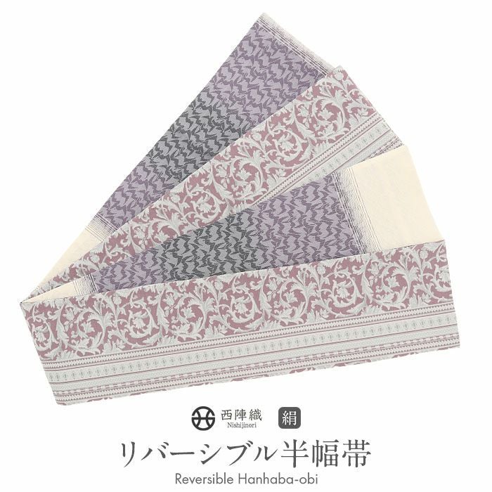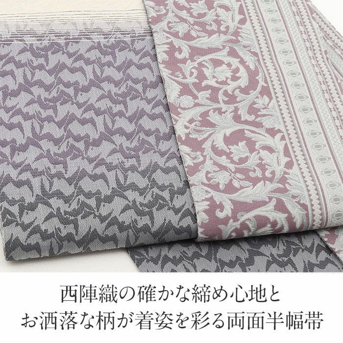 西陣織の名門・大光織物が丹精こめて織り上げた、風格あるリバーシブル半幅帯です。 繊細で緻密な織りの美しさに加え、アレンジしやすい長尺仕様で、日常の装いから特別な日のコーディネートまで幅広く活躍する一本です。 ■表面は、落ち着いたピンクを基調に、淡い緑が繊細に織り成す唐草が、クラシックで優雅な雰囲気を添えています。 ■裏面は、波が揺れるようなモチーフを取り入れたモダンな縞柄があしらわれ、落ち着いた色の切り替えが奥行きのある美しさを生み出します。 両面とも上質感あふれる意匠のため、その日の気分や着物に合わせて雰囲気の異なるコーディネートを楽しめるのが魅力です。 ■長さはゆとりのある長尺タイプ。 ふくら雀、文庫、変わり文庫、リボン結びなど、長さをいかした華やかな帯結びが美しく決まり、後ろ姿をいっそう印象的に仕上げてくれます。 リバーシブル仕様のため、どちらの柄を見せるか、結び方をどう変えるかによって、多彩な表情を生み出せるのも嬉しいポイントです。 本品は伝統工芸である西陣織によって仕立てられ、色糸を先に染めてから緻密に織り上げることで模様を作り出すため、完成までに多くの工程と高度な技術を要する高級絹織物です。 先染めならではの丈夫さやシワになりにくい性質を持ち、しっかりとした張りがあるため、美しい帯結びを長時間保ちやすいのも特長です。 一本加わるだけで装いの幅がぐっと広がる半幅帯。ぜひワードローブに取り入れて、着物コーディネートをより一層お楽しみください。