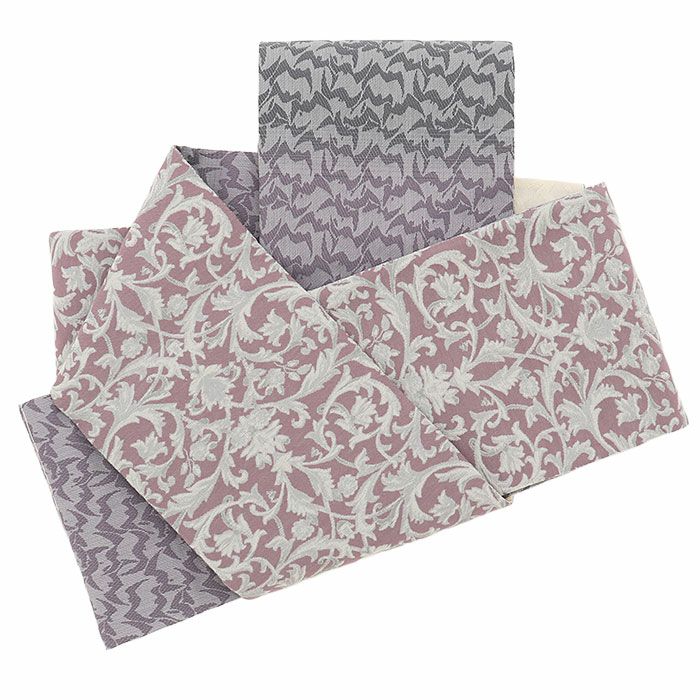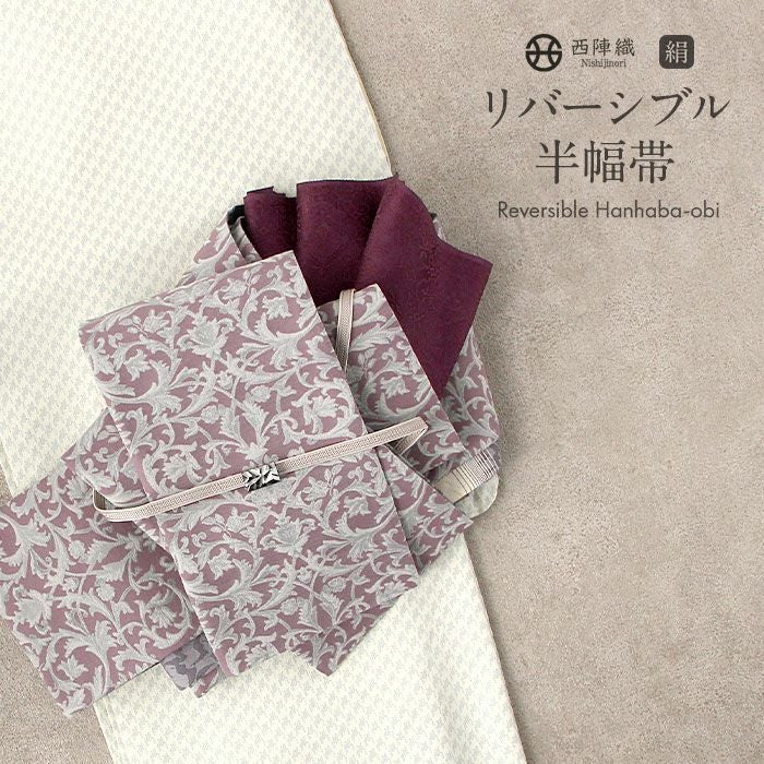 西陣織の名門・大光織物が丹精こめて織り上げた、風格あるリバーシブル半幅帯です。 繊細で緻密な織りの美しさに加え、アレンジしやすい長尺仕様で、日常の装いから特別な日のコーディネートまで幅広く活躍する一本です。 ■表面は、落ち着いたピンクを基調に、淡い緑が繊細に織り成す唐草が、クラシックで優雅な雰囲気を添えています。 ■裏面は、波が揺れるようなモチーフを取り入れたモダンな縞柄があしらわれ、落ち着いた色の切り替えが奥行きのある美しさを生み出します。 両面とも上質感あふれる意匠のため、その日の気分や着物に合わせて雰囲気の異なるコーディネートを楽しめるのが魅力です。 ■長さはゆとりのある長尺タイプ。 ふくら雀、文庫、変わり文庫、リボン結びなど、長さをいかした華やかな帯結びが美しく決まり、後ろ姿をいっそう印象的に仕上げてくれます。 リバーシブル仕様のため、どちらの柄を見せるか、結び方をどう変えるかによって、多彩な表情を生み出せるのも嬉しいポイントです。 本品は伝統工芸である西陣織によって仕立てられ、色糸を先に染めてから緻密に織り上げることで模様を作り出すため、完成までに多くの工程と高度な技術を要する高級絹織物です。 先染めならではの丈夫さやシワになりにくい性質を持ち、しっかりとした張りがあるため、美しい帯結びを長時間保ちやすいのも特長です。 一本加わるだけで装いの幅がぐっと広がる半幅帯。ぜひワードローブに取り入れて、着物コーディネートをより一層お楽しみください。