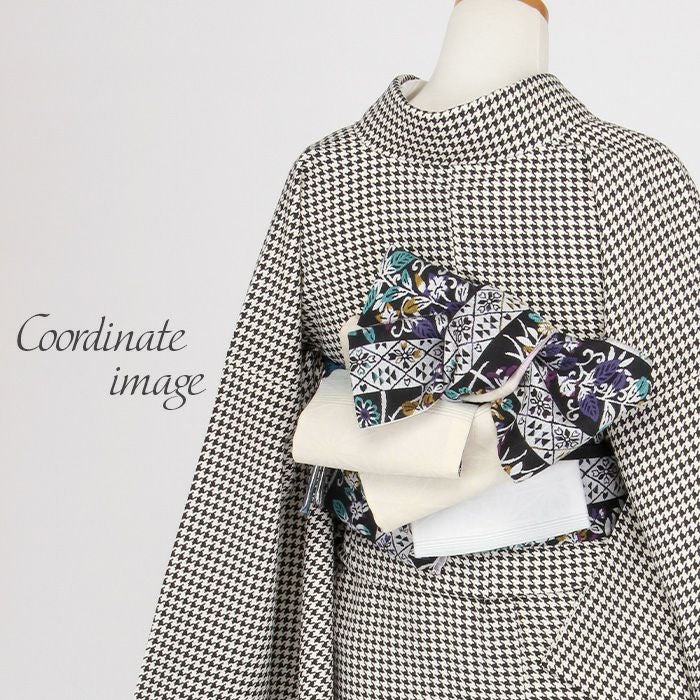 西陣織の名門・大光織物が丹精こめて織り上げた、風格あるリバーシブル半幅帯です。 繊細で緻密な織りの美しさに加え、アレンジしやすい長尺仕様で、日常の装いから特別な日のコーディネートまで幅広く活躍する一本です。 ■表面は、深みのある黒地を背景に、色とりどりの糸で花唐草が華やかに織り上げられています。 アクセントに白ライン柄があしらわれ、花文とのコントラストが洗練されたモダンさを引き立てています。 ■裏面は、優しい色合いの縞模様に麻の葉文様があしらわれ、色の切り替えが奥行きのある美しさを生み出します。 両面とも上質感あふれる意匠のため、その日の気分や着物に合わせて雰囲気の異なるコーディネートを楽しめるのが魅力です。 ■長さはゆとりのある長尺タイプ。 ふくら雀、文庫、変わり文庫、リボン結びなど、長さをいかした華やかな帯結びが美しく決まり、後ろ姿をいっそう印象的に仕上げてくれます。 リバーシブル仕様のため、どちらの柄を見せるか、結び方をどう変えるかによって、多彩な表情を生み出せるのも嬉しいポイントです。 本品は伝統工芸である西陣織によって仕立てられ、色糸を先に染めてから緻密に織り上げることで模様を作り出すため、完成までに多くの工程と高度な技術を要する高級絹織物です。 先染めならではの丈夫さやシワになりにくい性質を持ち、しっかりとした張りがあるため、美しい帯結びを長時間保ちやすいのも特長です。 一本加わるだけで装いの幅がぐっと広がる半幅帯。ぜひワードローブに取り入れて、着物コーディネートをより一層お楽しみください。