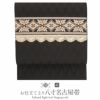 届いて直ぐに使えるお仕立て上がりの八寸名古屋帯です。 本場筑前博多織は、その締め心地のよさから多くのきもの愛好家に好まれているお品です。 本商品はキステオリジナルデザインで、独創的な柄付けと細やかな織りが自慢のワンランク上の作品です。 シックな黒の帯地には、落ち着きある茶色でアールデコ調の幾何学模様を細かく丁寧に織り上げてもらいました。目立ちすぎず、控えめ過ぎない絶妙なサイズの織柄は光の当たり具合で柄が浮かび上がり、大人の着こなしを上品に盛り上げてくれます。 お太鼓部分には、繊細な菱型模様やリーフ模様などの刺繍が施されたインド刺繍リボンをチョイス。所々に煌めくスパンコールも控えめながらとても印象的に光ります。 やや直線的でクールな雰囲気がメインだったデザインに、シャンパンゴールドの立体感のあるレースをあしらうことで柔らかさもプラス。かっこよさを持ちつつ、他にはない大人可愛いデザインに仕上がりました。 絹糸100%で織り上げているため、通気性や吸湿性に優れ、季節を問わずお使いいただけます。 本商品は開き仕立てになりますので、ご利用される方の身長や体格で前腹の幅を調整して頂ければ、よりバランス良くご着用して頂けます。 博多織独特の絹鳴りと正絹ならではの柔らかな光沢をもつ帯は、人と差がつく着姿を演出します。 観劇、芸術鑑賞、ショッピング、ちょっとしたお出掛け等幅広くご活用いただけます。 日常のお洒落に本場筑前博多織の帯をご堪能下さい。