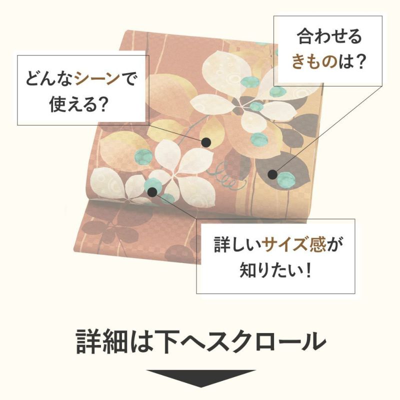 洋風モダンなデザインの「召しませ花」シリーズ。 全通柄でもあり、お太鼓柄でもある“よくばり”デザインが独特で、後ろ姿も前姿もポイントの絵柄が現れる360度おしゃれな京袋帯です。 しっかりとした張り感の正絹生地には市松模様が織り込まれ、単調でない風合いがより一層洒落感を引き立てています。 洋風モダンなテイストの着こなしをお楽しみいただけるこの帯はキステスタッフも絶賛♪レトロポップな洒落感あふれるデザインです。
