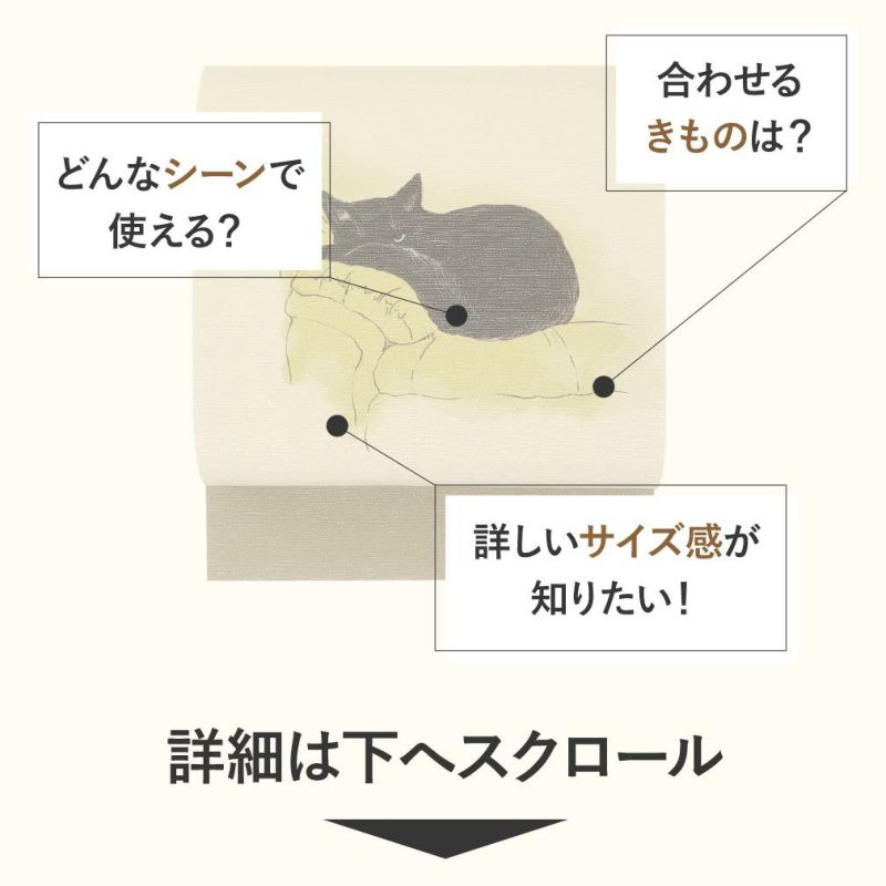 かわいらしく一点ごとに物語性のある召しませ花の京袋帯です。 クリーム色の生地に、黄緑色のソファーでくつろぐ黒猫が描かれた大人かわいい雰囲気。 綺麗な色合いの帯は、和にもモダンにも着こなせそうなデザイン。 正絹なので手触りもよく、柔らかくて締めやすいので使い勝手も良いと、ご好評いただいています。 また、帯地に織り込まれた銀糸が光の加減で優しく光り、ポリエステルでは出ない高級感も感じさせてくれます。 こちらの京袋帯はすでにお仕立てが済んでいるので、届いたらすぐに使えるのも魅力の一つ。 ちょっと個性的なコーデを探している人に是非お勧めしたい商品です。