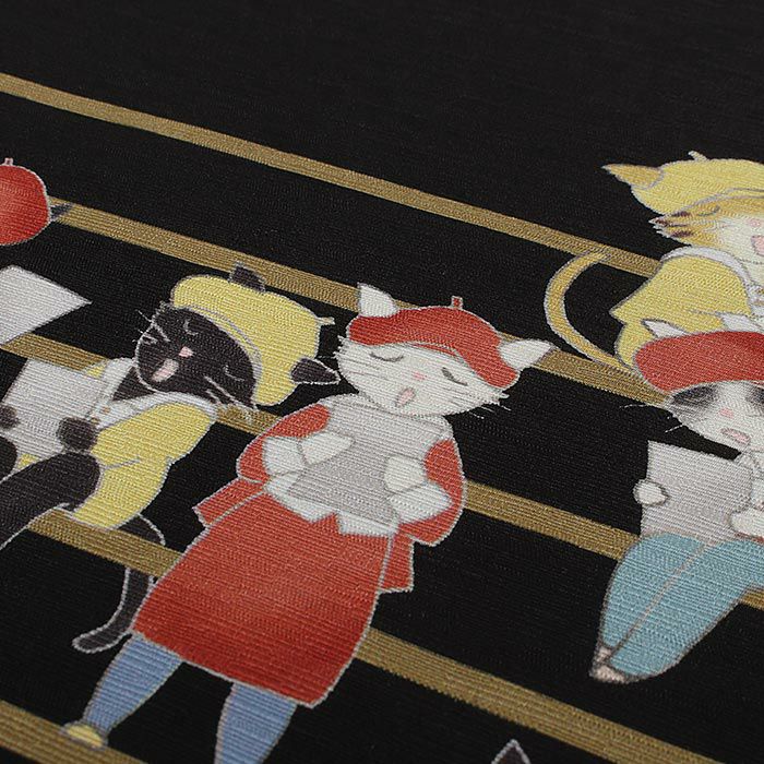京袋帯 正絹 黒 Let’s Sing 猫 WAKKA 仕立て上がり おび なごや帯 名古屋帯 カジュアル おしゃれ 普段用 未使用 新品 春 秋 冬