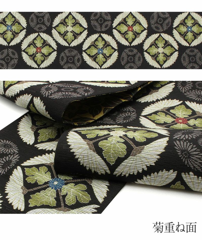 かわいらしく一点ごとに物語性のある召しませ花の半巾帯です。 お洒落な柄が着姿を華やかに彩る、リバーシブル小袋帯は、 裏側をちらりと見せてワンポイントにしてみたり、リボン結びで裏と表両方見せてみたり、 色々な結び方で着物姿を粋に演出することができます。 菊の花と葉で組み合わされた七宝柄が上品で古典柄なデザイン。 裏地は、からし色に白色の草花模様が施された、可愛らしいモダンな印象。 絹とポリエステルを合わせて織り合わせており、しなやかな手触りと締め心地の良い逸品です。 丁寧に仕上げられた信頼のある日本製の帯は、仕立て上がりですので、お届け後すぐにお召しいただけます。 小紋や紬などの普段のお着物にあわせてみたり、注目を集めること間違いなしの1本です。 自由な帯結びで個性的なコーディネートがお楽しみいただけます。